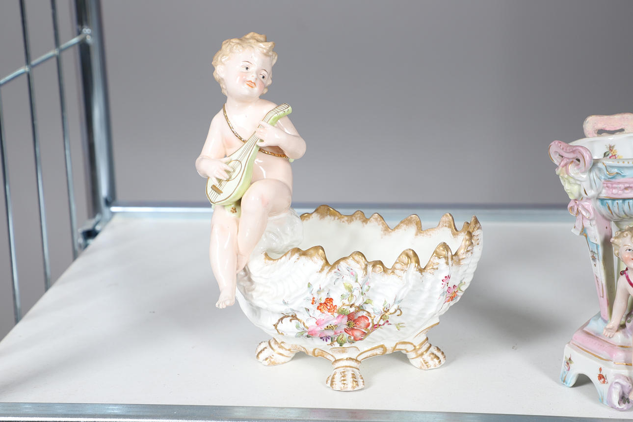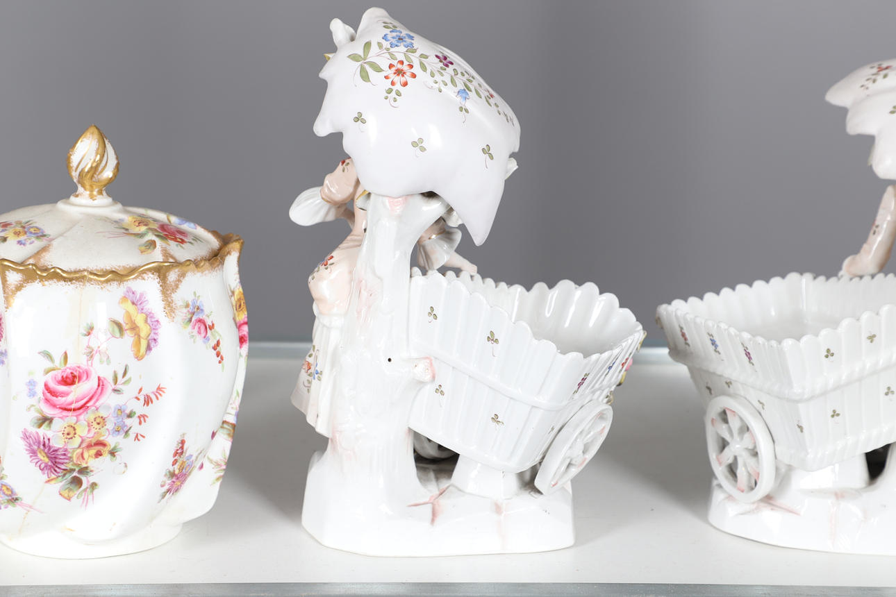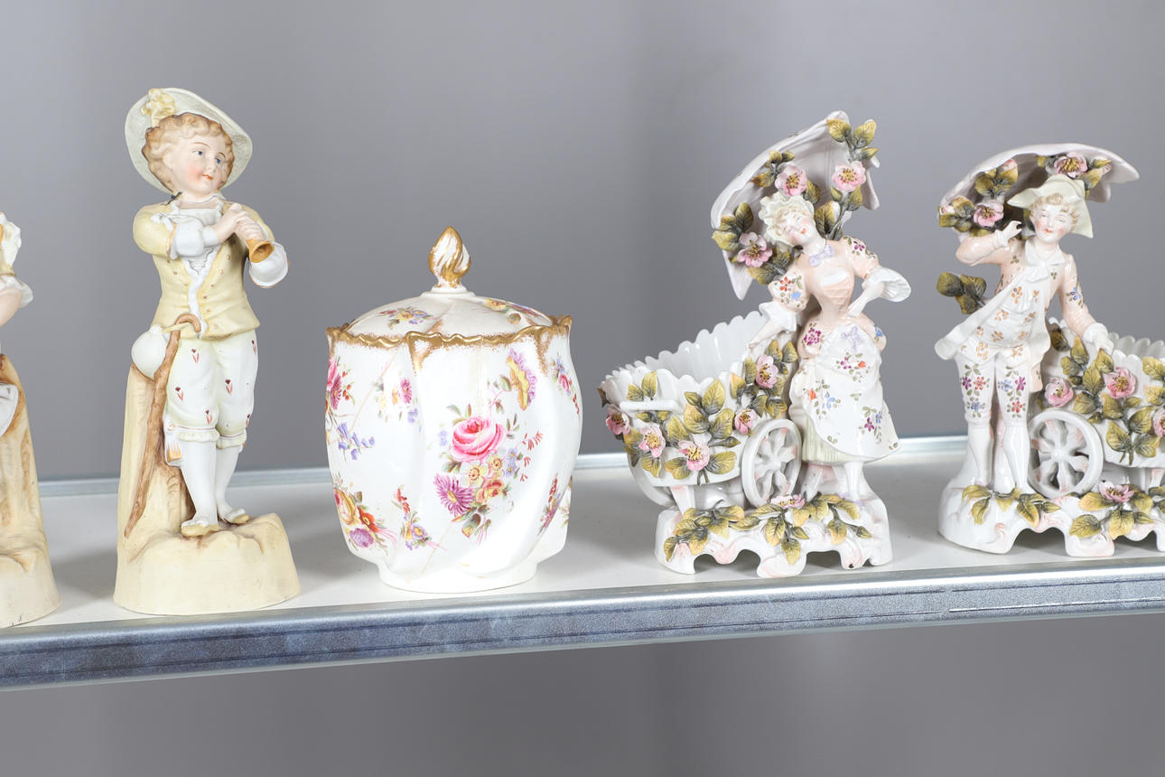 Ett blandat parti inklusive ett par figurvaser inklusive små vagnar (22 cm höga), kerubkruka i Sitzendorf-stil, ett par rodnade elfenbensvaser (20 cm höga) och olika andra keramiker. Vissa skador.