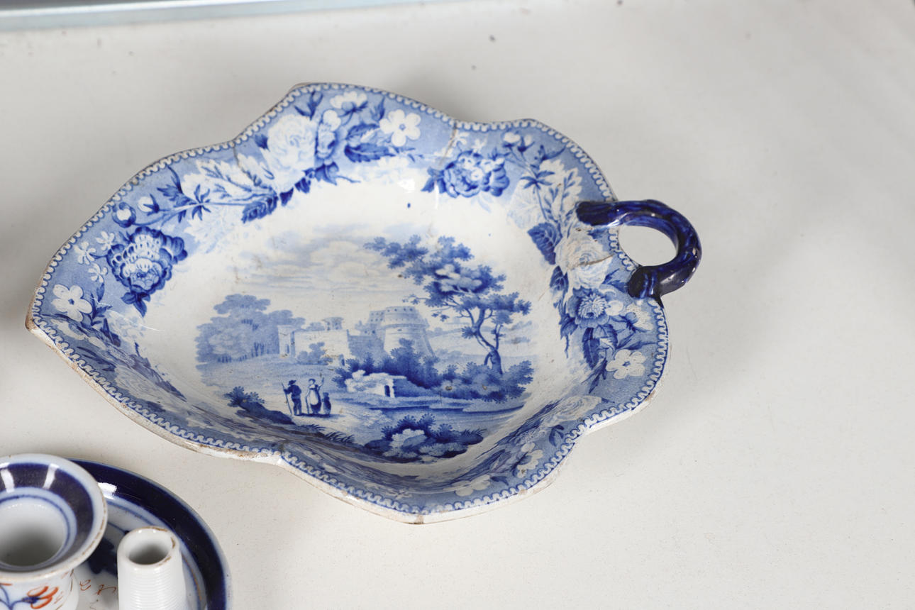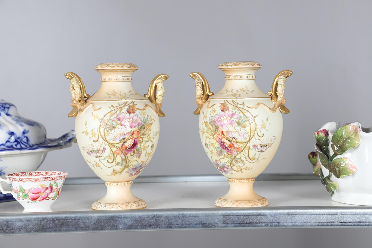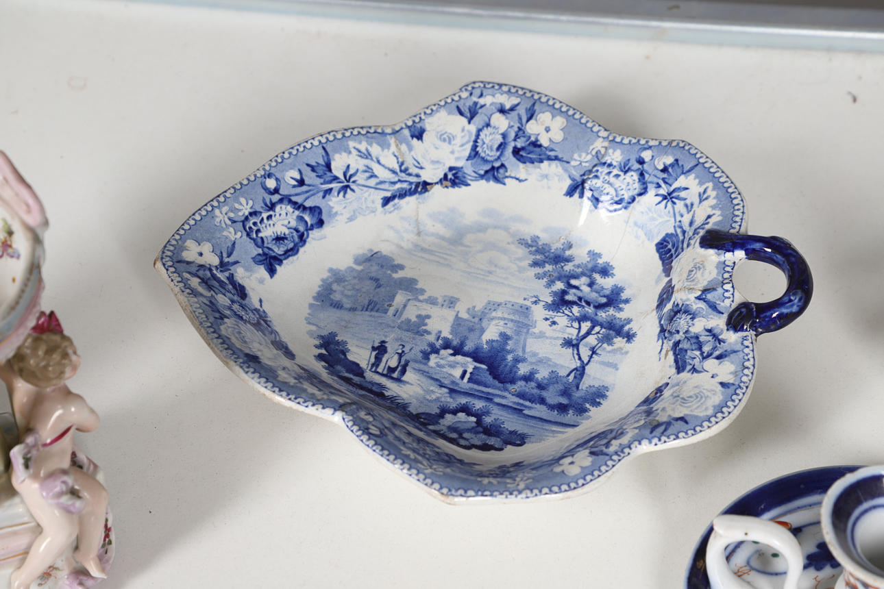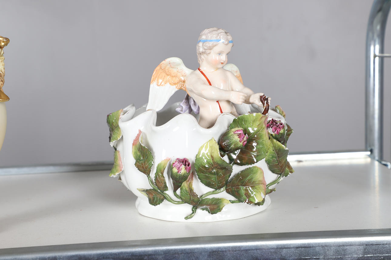 Ett blandat parti inklusive ett par figurvaser inklusive små vagnar (22 cm höga), kerubkruka i Sitzendorf-stil, ett par rodnade elfenbensvaser (20 cm höga) och olika andra keramiker. Vissa skador.