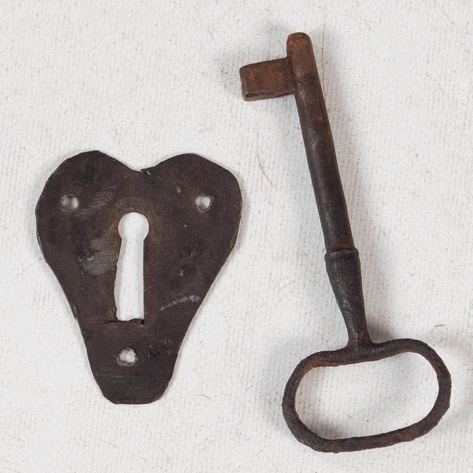 Originalgångjärn och beslag, spår av äldre nyckelskylt.