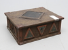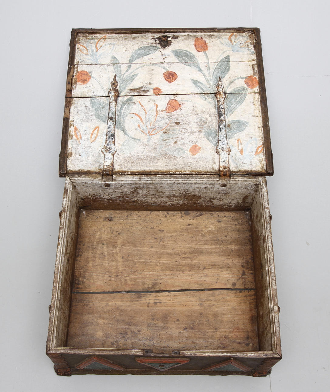 Runmålat med triangelformade dekorer. Invändig målning på locket.Längd 48,bredd 41,höjd 19 cm.