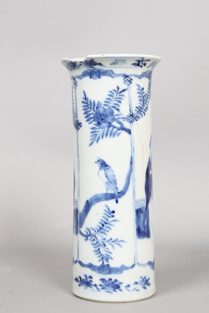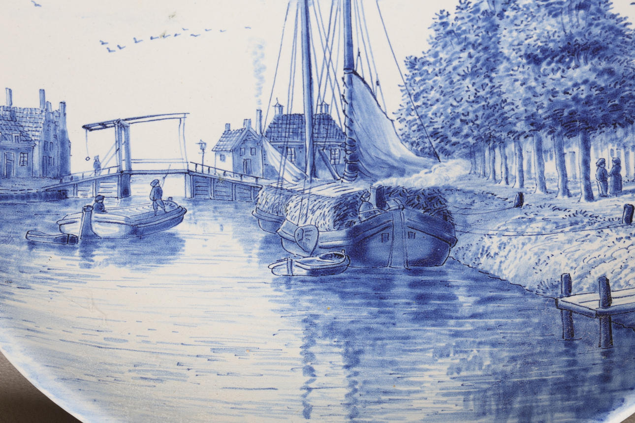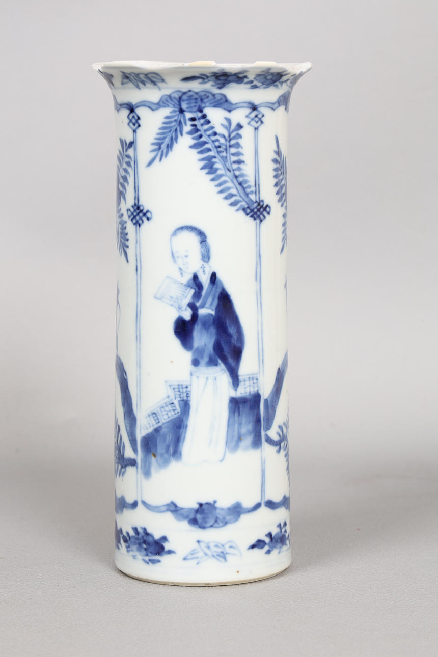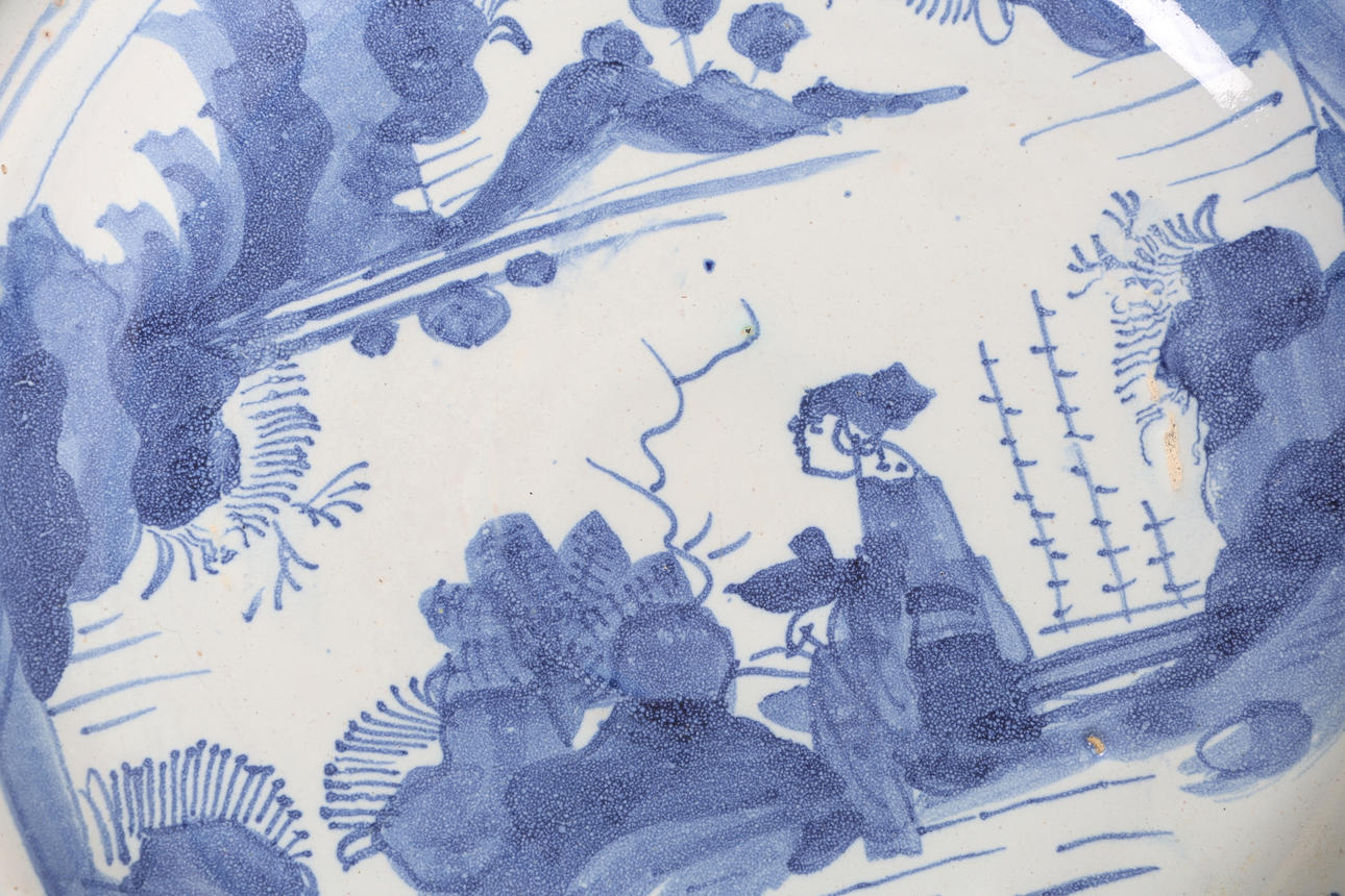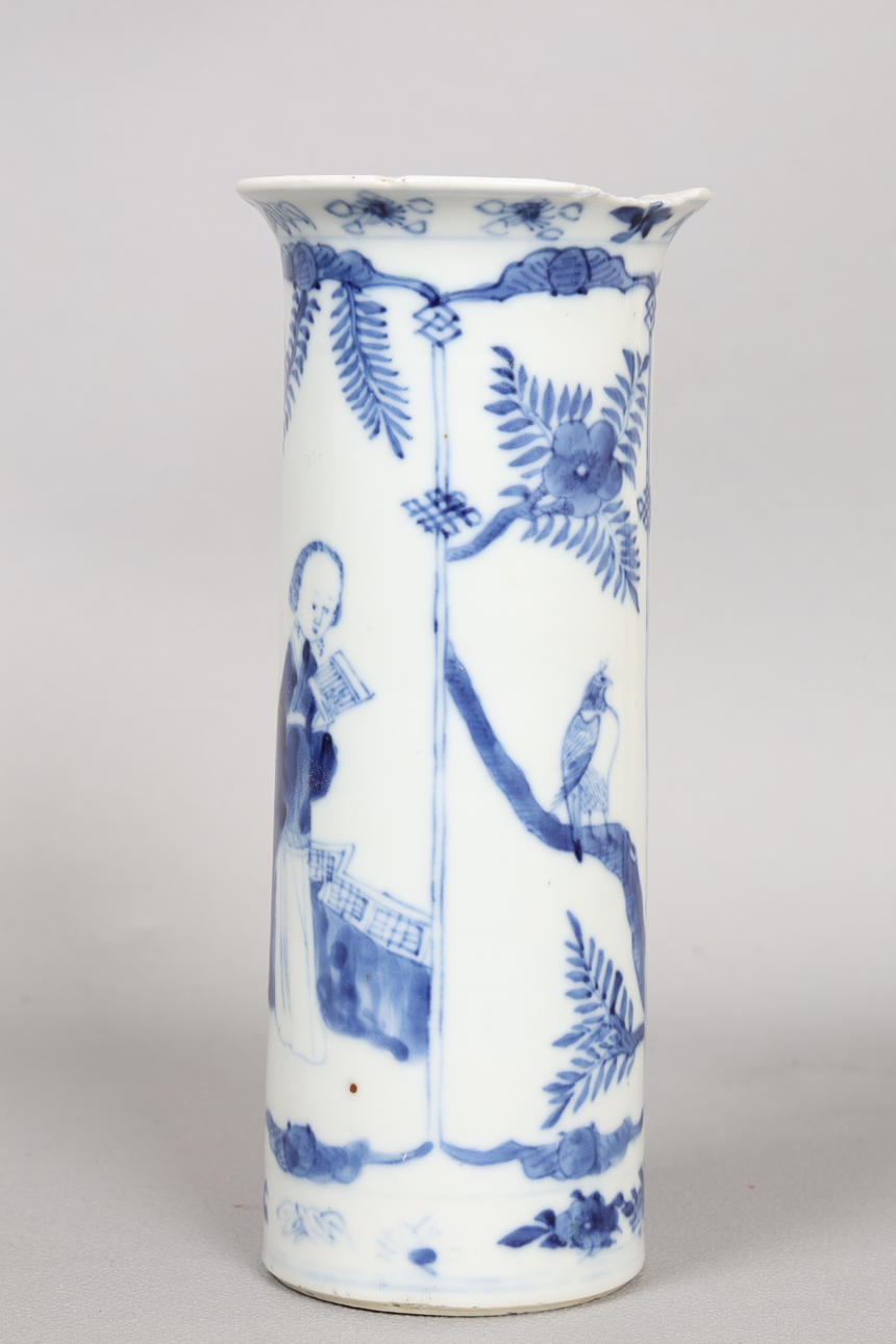 Inkludera en engelsk Delft-tallrik med figur- och landskapsdekoration, 24,5 cm diameter, en holländsk Delft-laddare med båt och avlägsen bro, 30,5 cm diameter, en japansk porslinsplatta med blommande grendekoration, 25,5 cm diameter, en kinesisk cylindervas med utsvängd kant, kroppen dekorerad med figurer som håller abaci och med rovfåglar på grenar, med fyra karaktärsmärken till basen, 20 cm hög (4).