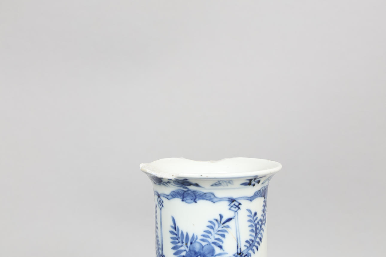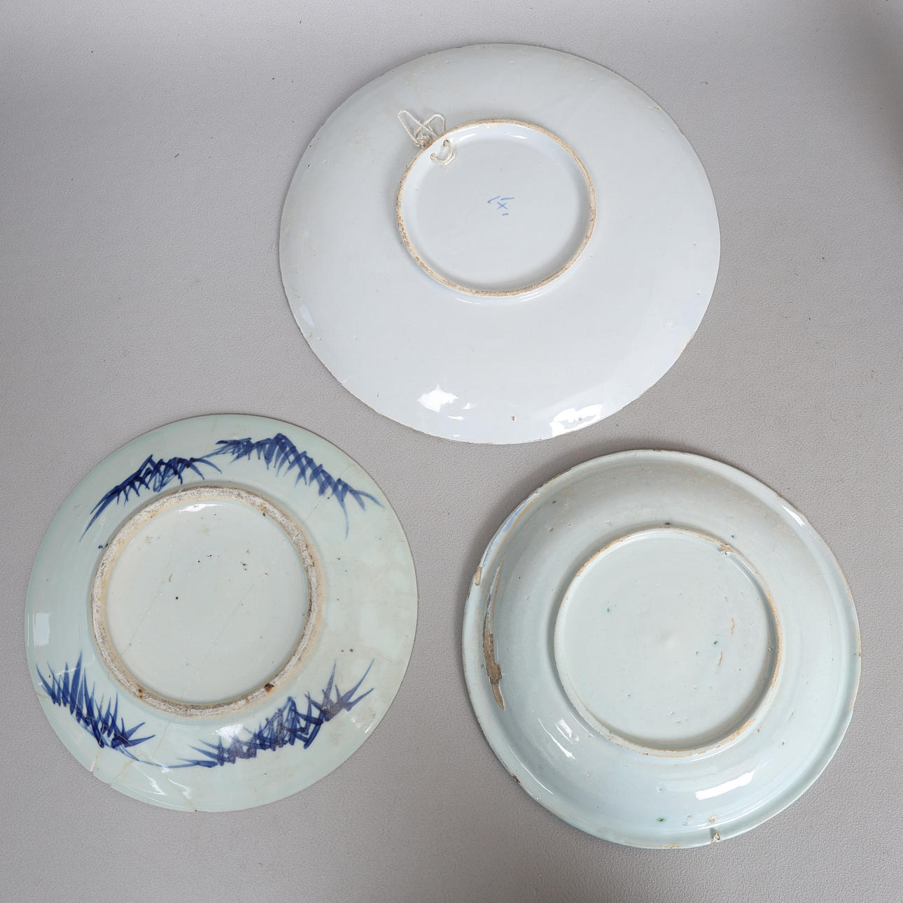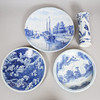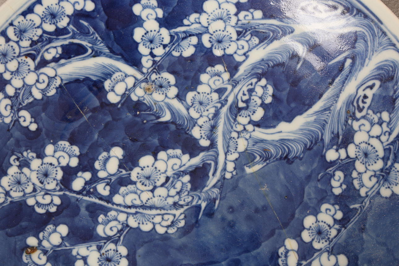 Japansk tallrik har brutits och restaurerats, holländsk laddare med chips och förluster till fälgen, kinesisk vas med chips och förluster på fälgen och Y-formad spricka på kroppen, engelsk delftplatta med små chips och förluster.