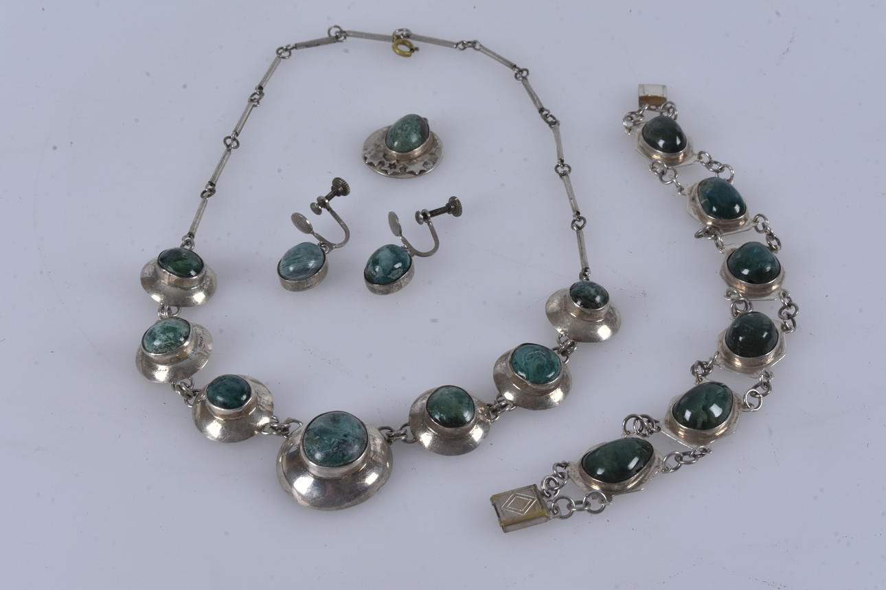 SMYCKESSET, 5 delar, silver med malakit, 1900-tal.
