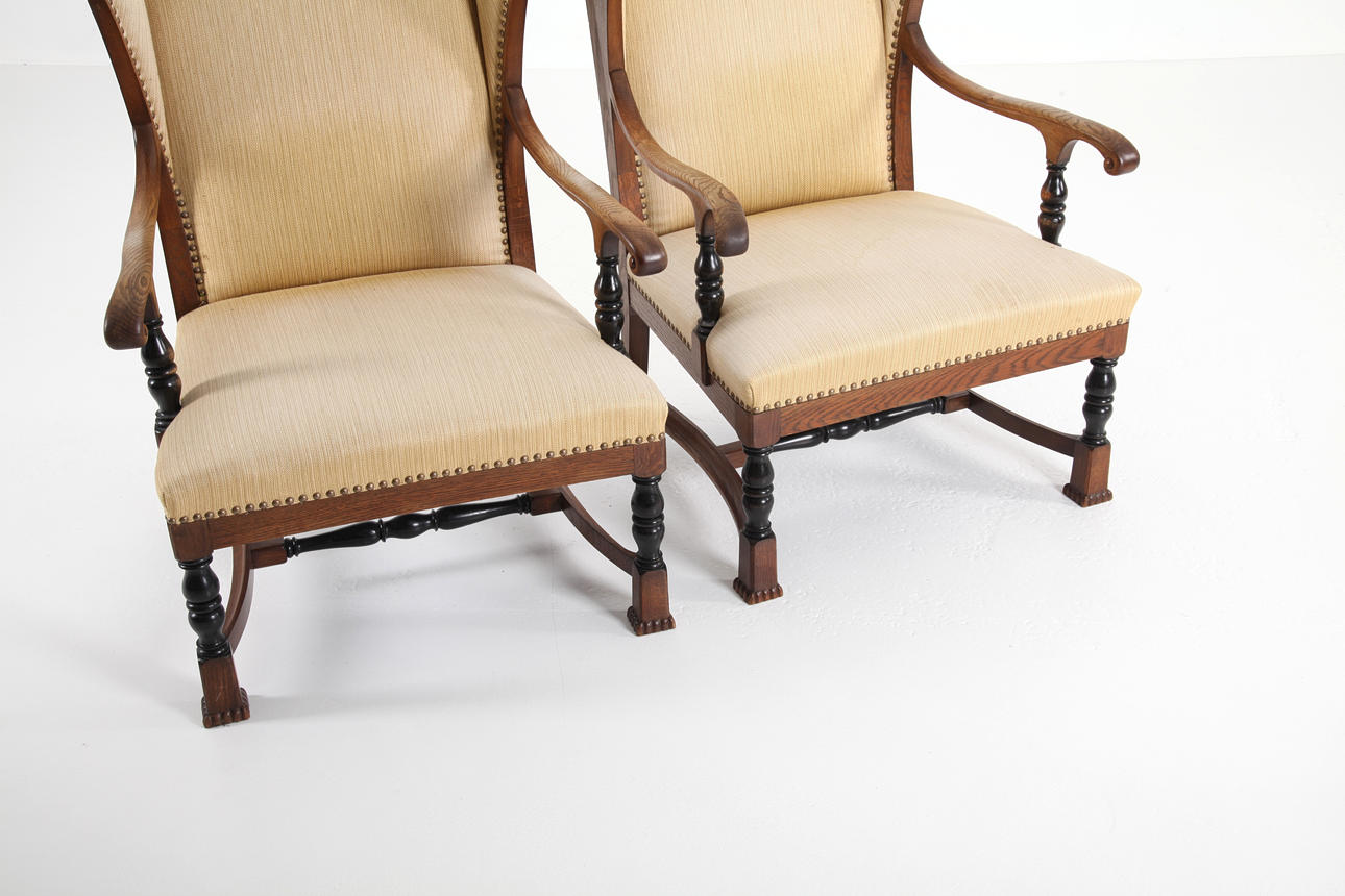 Ett par öronlappsfåtöljer, ek, pärlspikad bård på textilklädsel, fast stoppad sits. Sverige 1930-tal.