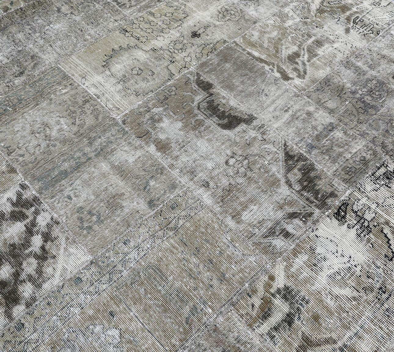 Handknuten patchworkmatta, sammansatt av äldre mattfragment. Material i ull på bomullsvarp. Dominerande i grå och beige toner med varierande mönsterpartier.