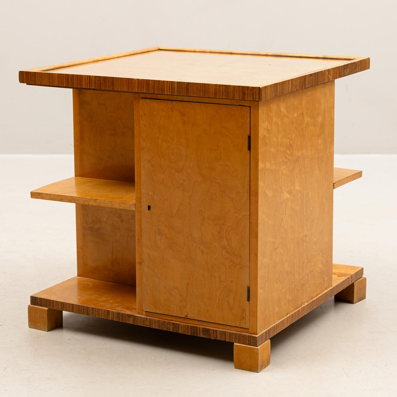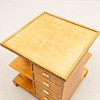 Ljus björk, kant med fanérad list och glasskiva. Underliggande skåp och lådor. Ca 60 x 60, höjd 60 cm.