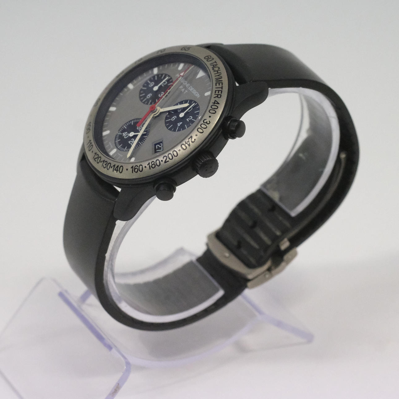 Silverfärgad urtavla, märkt: "PORSCHE DESIGN PAT".