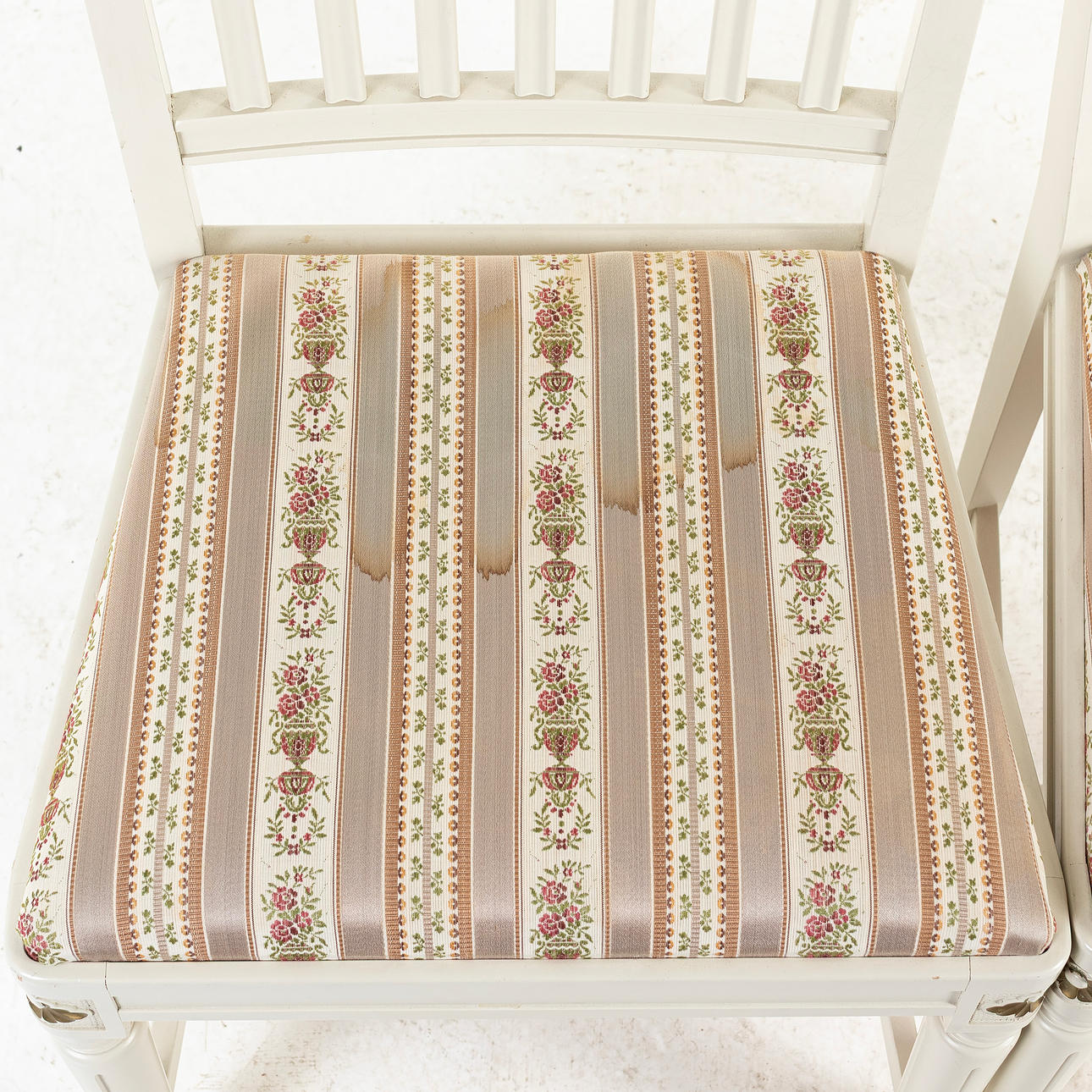 En sits med fläck, övrigt normalt bruksslitage och ytsmuts.