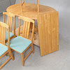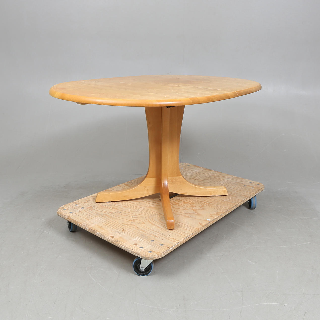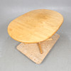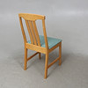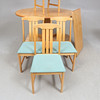 Bord + fyra stolar. Skiva ca 140x100cm + en iläggsskiva á ca 50cm. Höjd ca 73cm. Stolens sitthöjd ca 43cm.