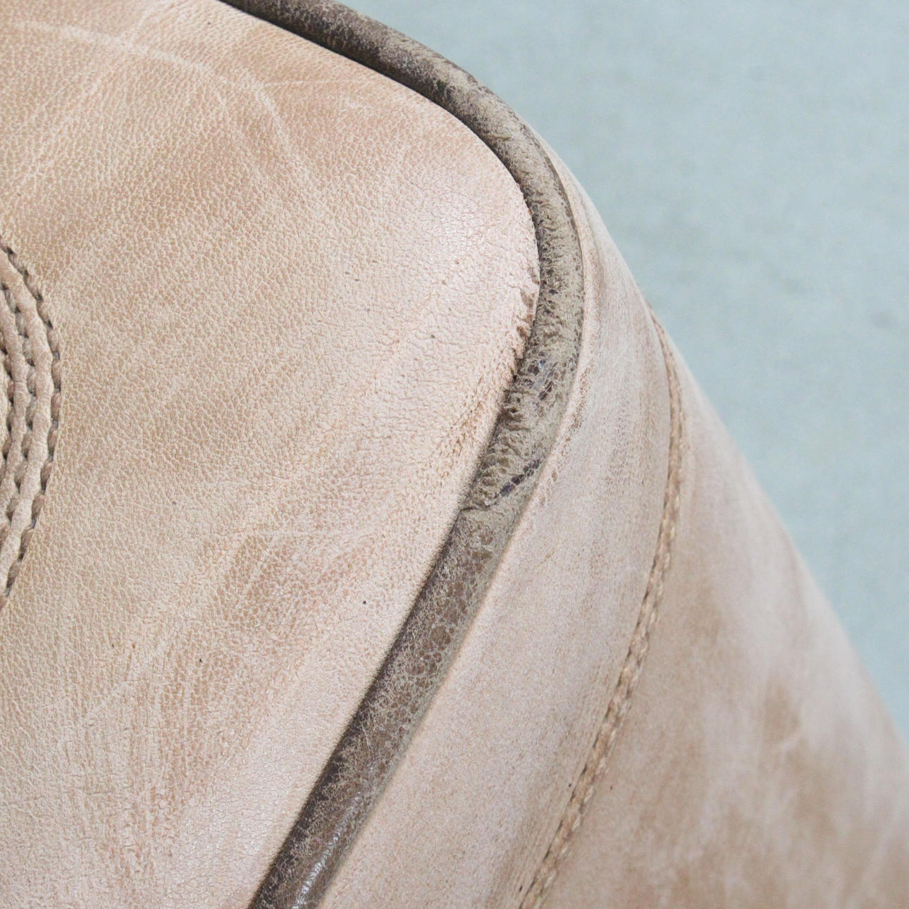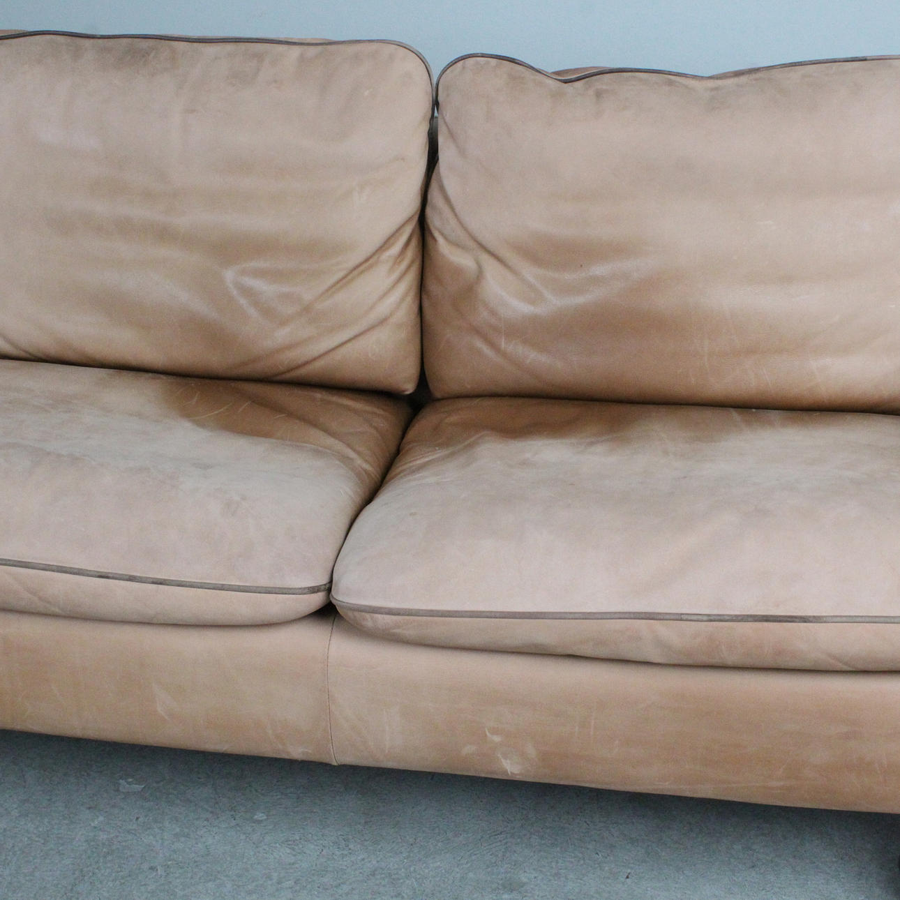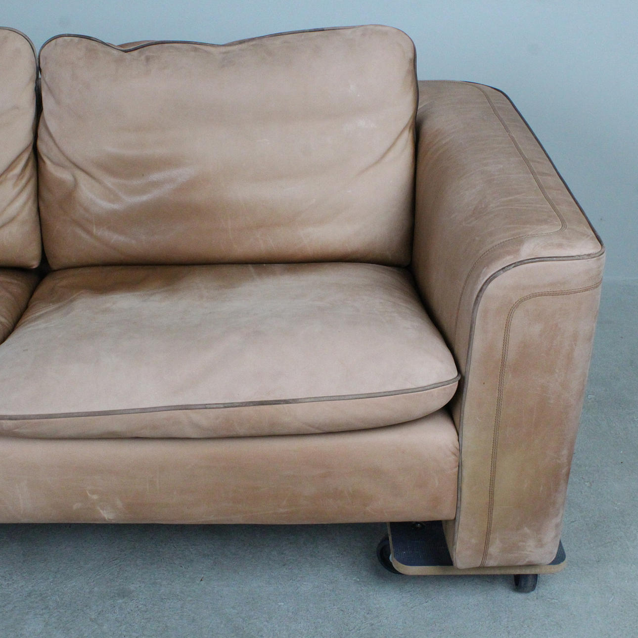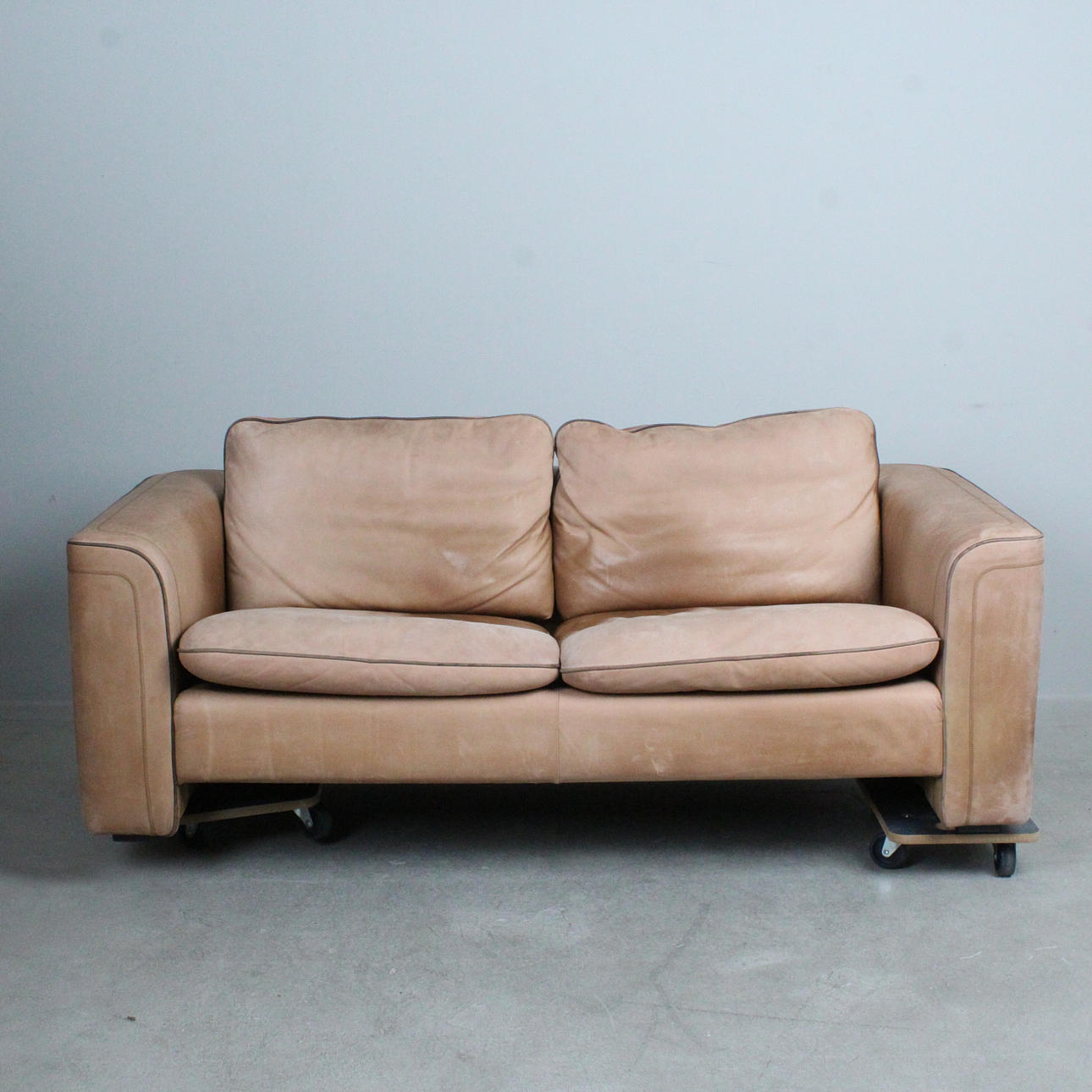 De Sede, soffa/tvåsitsig, läder, Schweiz, 1970-tal, stoppad konstruktion täckt med ljusbrunt läder, sits och ryggklädsel, klädd med tillverkare,