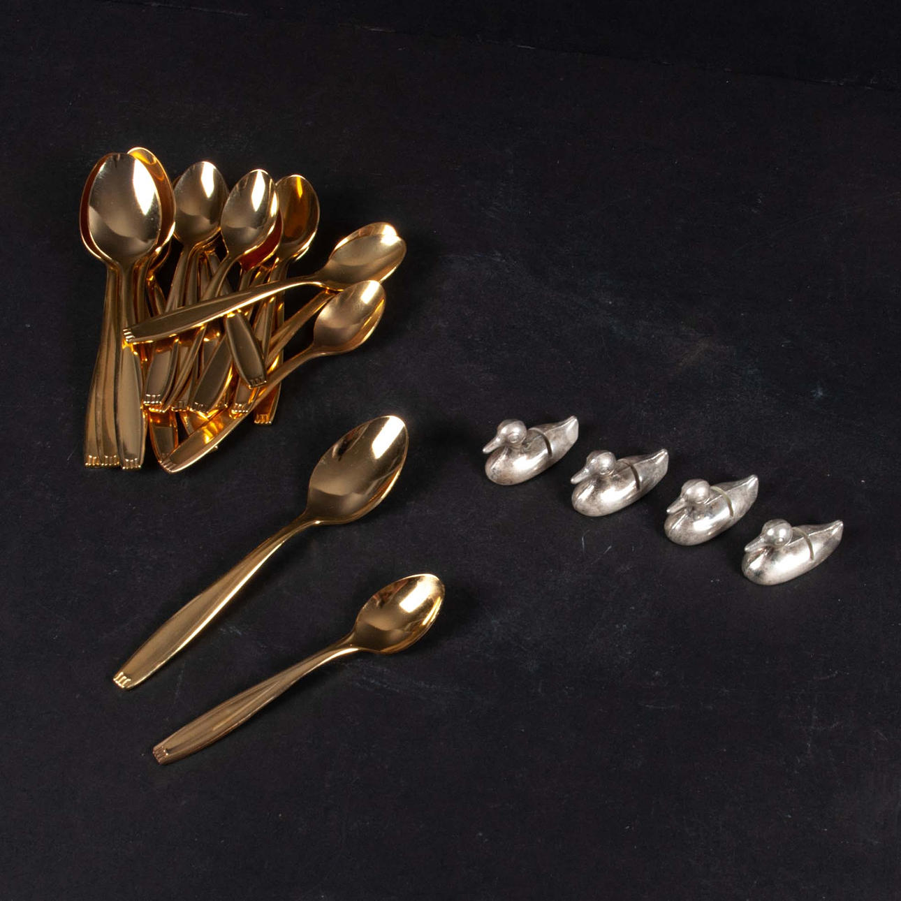 20 st skedar mäter 11 resp 13 cm, 4 st små visitkortshållare ca 4 x 2,5 cm.