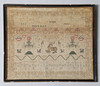med upprepade kanter ovanför djur och blommönster, inrymda i en eboniserad och glaserad ram 43,5 cm x 40,5 cm.
