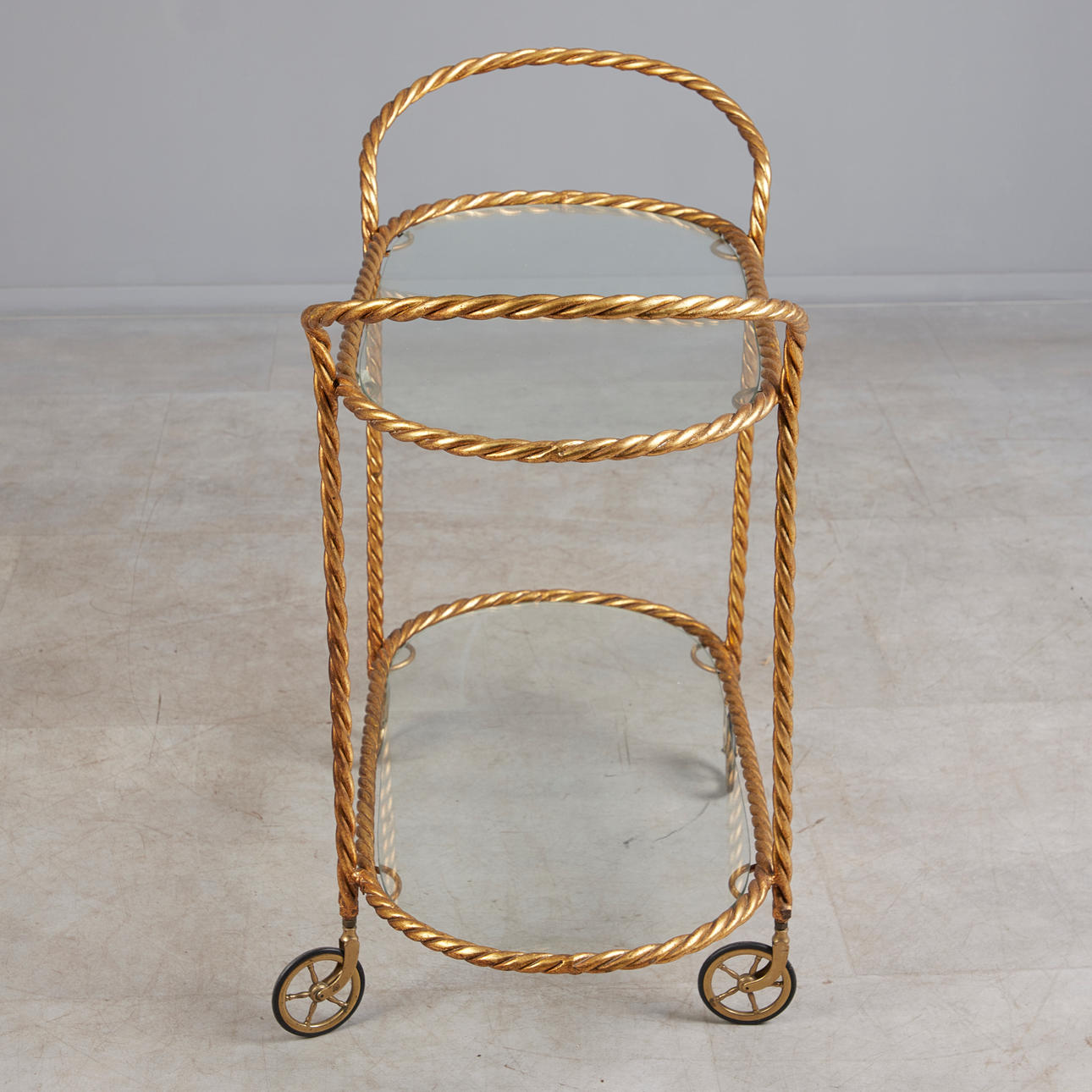 Serveringsvagn med guldfärgad träram, med två ovala glashyllor, h.85,5 cm, b98 cm, d.45,5 cm.