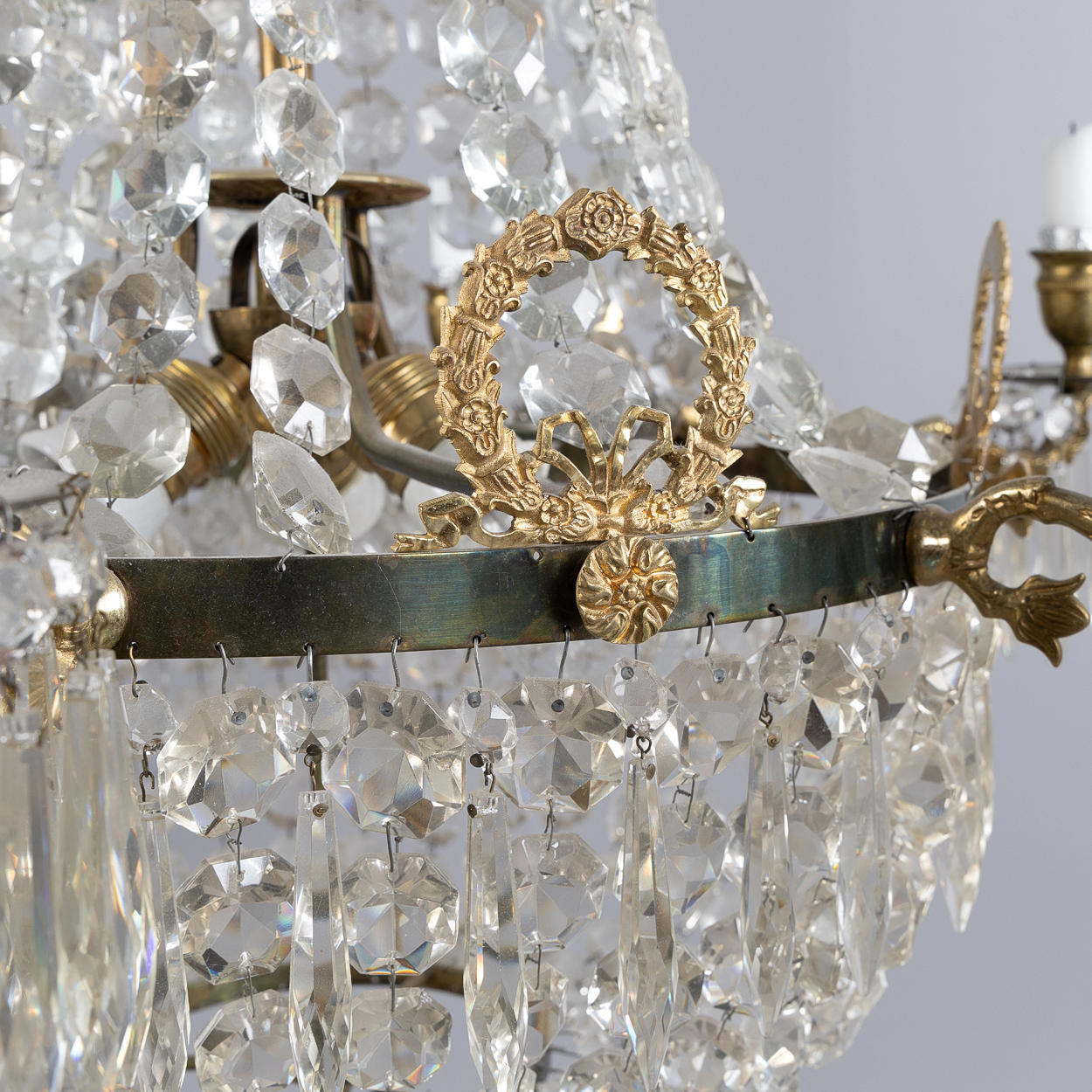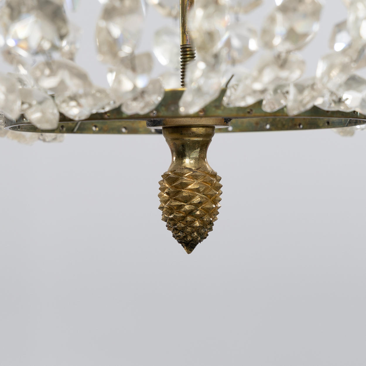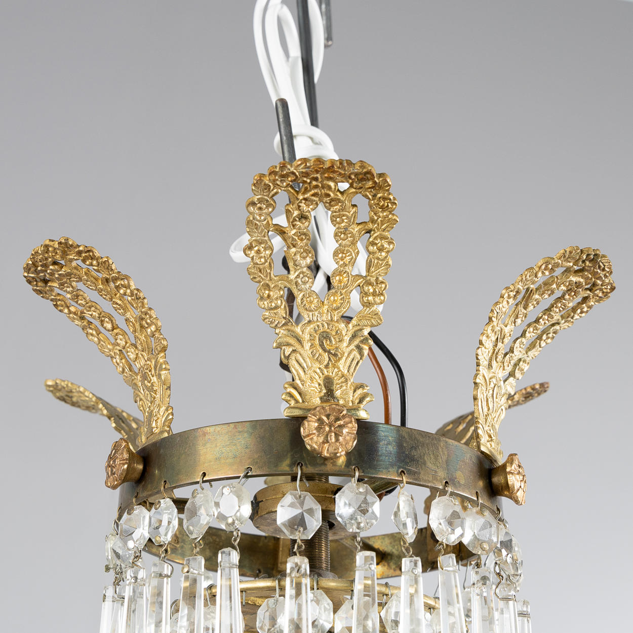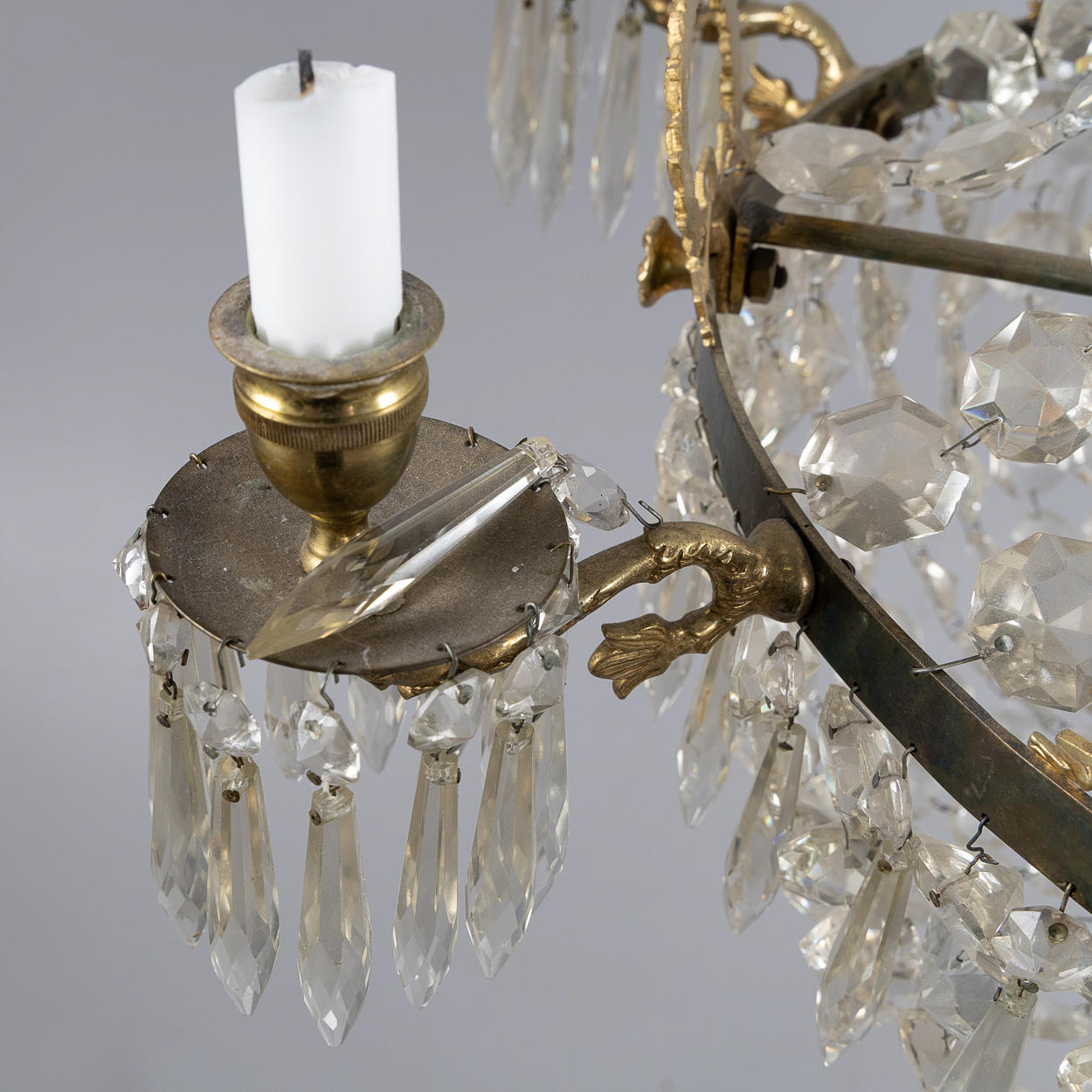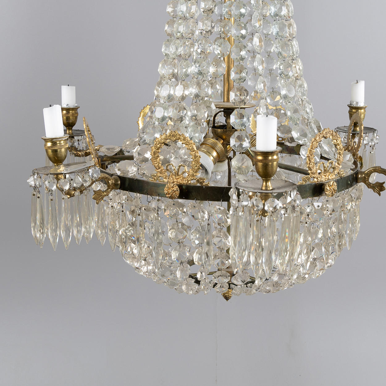 Stomme i mässing, 6 ljusarmar, elektrifierad, höjd ca 87, diameter 66 cm.