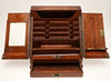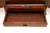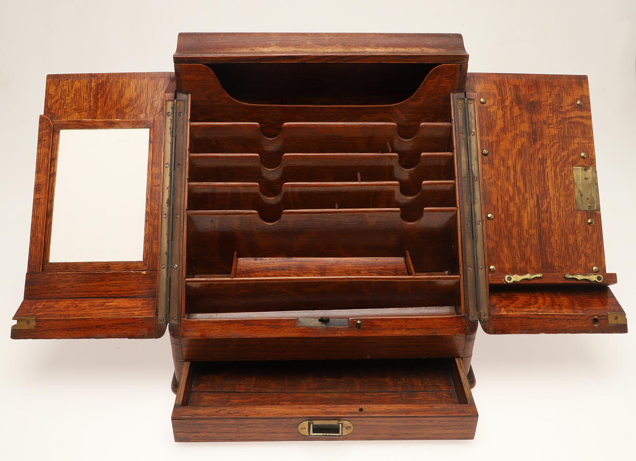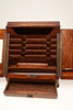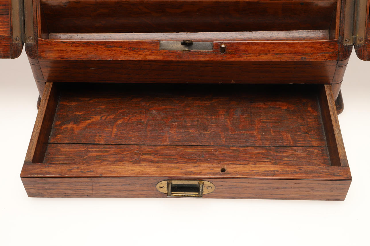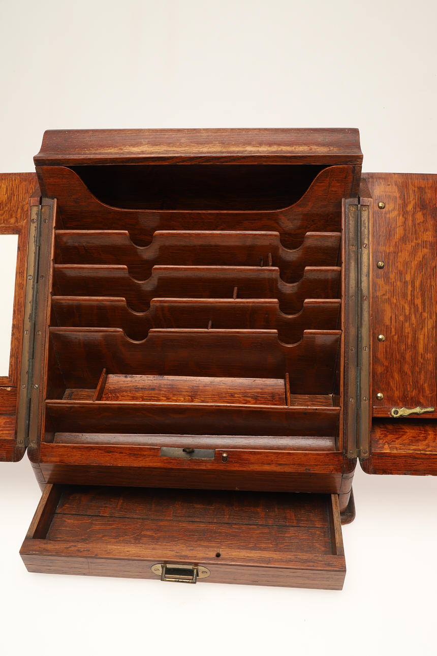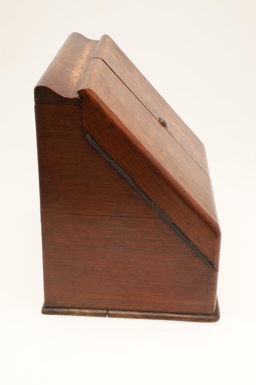 De sluttande dubbeldörrarna öppnas för att avslöja förvaringsfack och fack för brev/papper, ovanför en enda lång låda med infälld mässingshandtag. Ingen nyckel. Höjd 32,5 cm x Bredd 33 cm x Djup 25 cm.