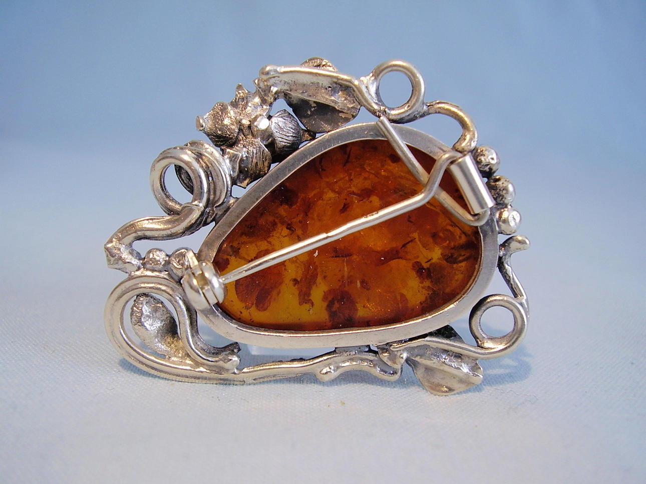silver 925. Längd 4,5 cm, bredd 3,8 cm, Bernstein 2,8 x 2,0 cm, vikt 14,3 gram.