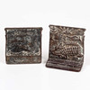 Stiliserat bokstöd i kraftig brons med reliefdekor föreställande en asiatisk drake framför en stigande sol, med pagod till vänster och blommotiv i mitten