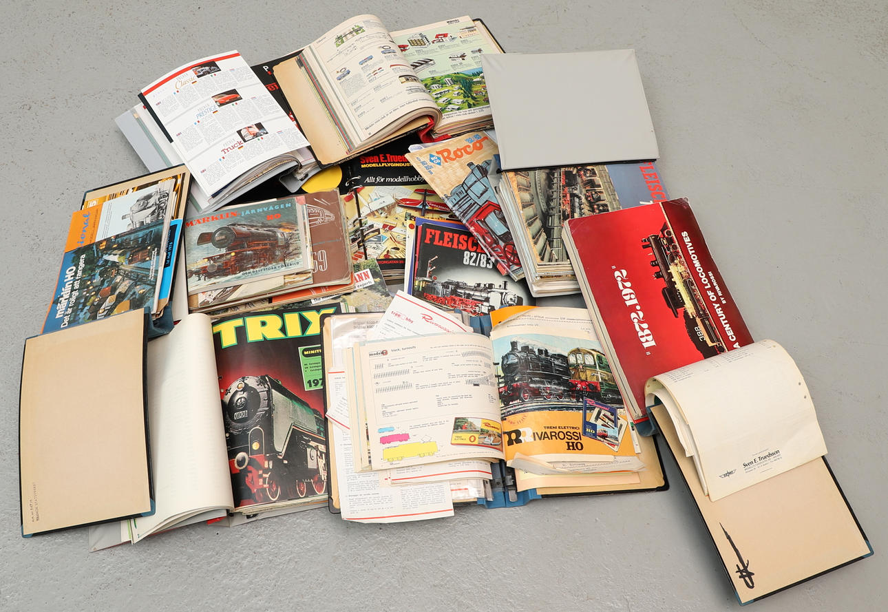 9 st pärmar, ca 31,5x27 cm och mindre. Lösa kataloger/häften. Bl.a. Märklin, Pocher, Minitrix, Arnold Rapido.