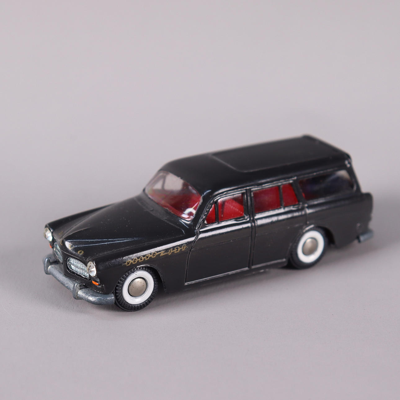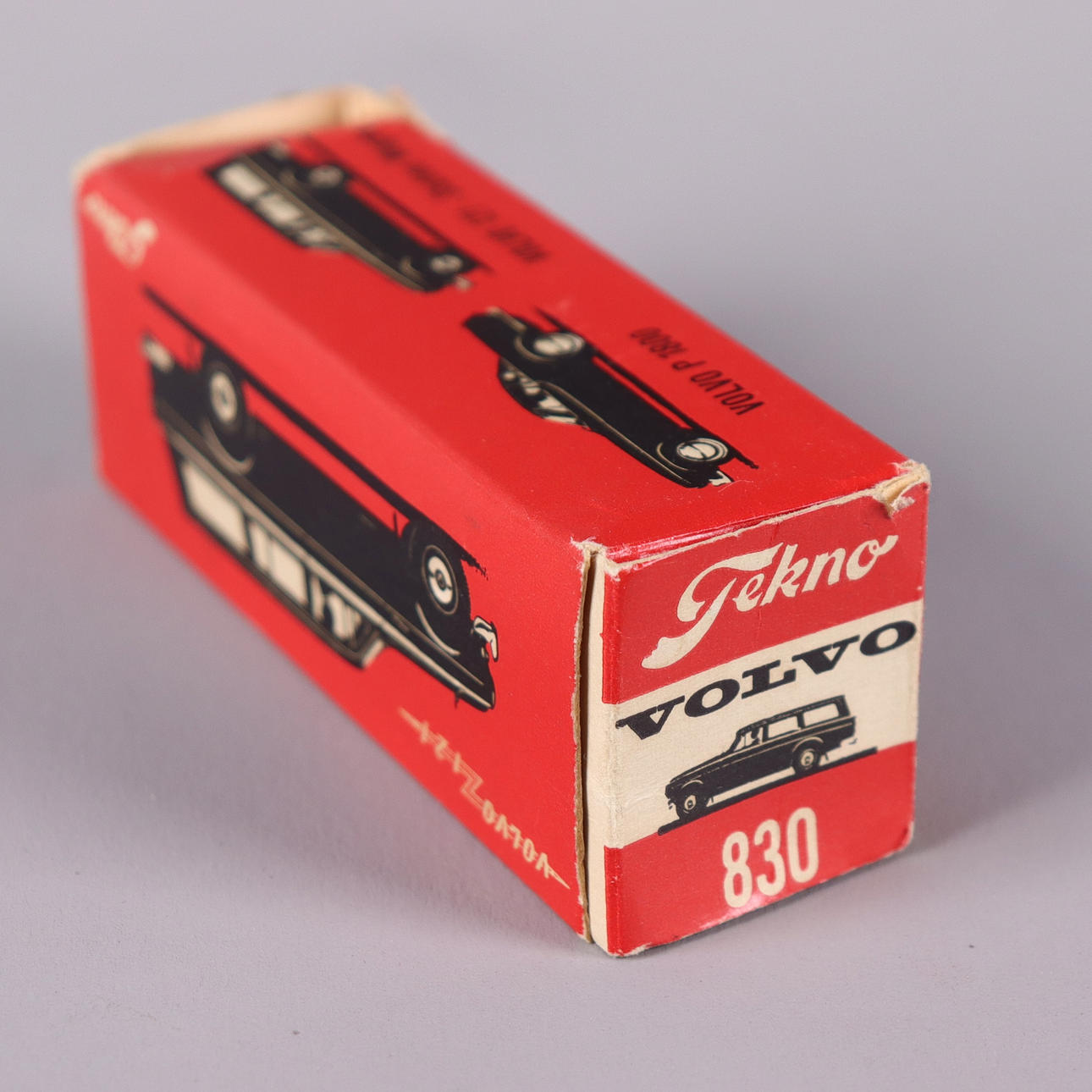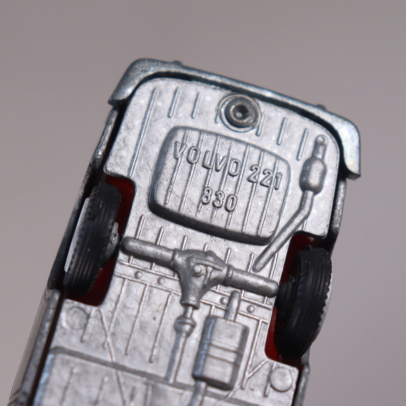 Längd 10,3 cm. Originalkartong, röd, 10,5 x 4 x 3,5 cm. Öppningsbar baklucka. Underrede: "Volvo 221 - 830". Skala 1:43.