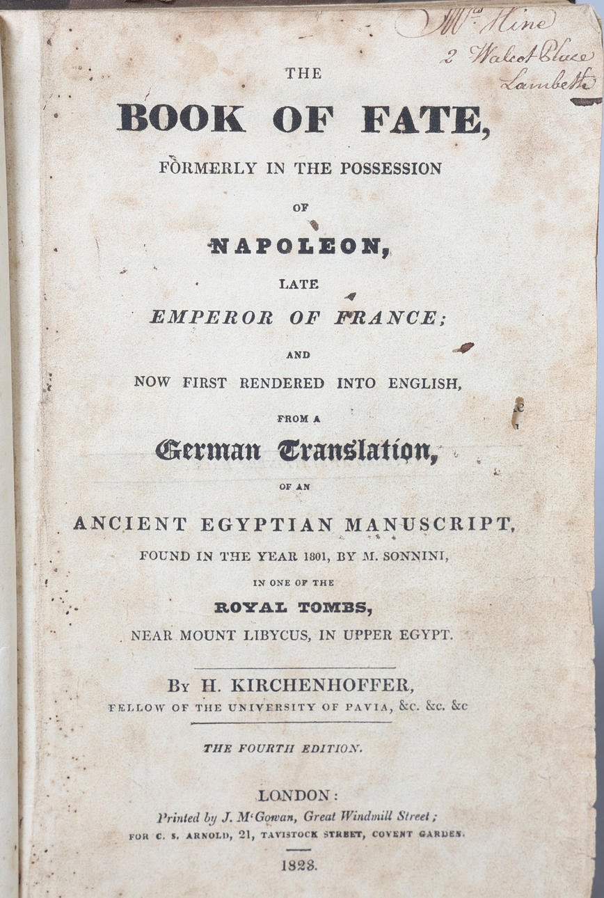 Ödesboken, tidigare i besittning av Napoleon, den sena kejsaren av Frankrike; och nu först återgiven till engelska, från en tysk översättning, av ett forntida egyptiskt manuskript, som hittades år 1801, av M Sonnini i en av de kungliga gravarna, nära berget libycus, i övre Egypten. Tryckt av J. McGowan London 1828, med läder- och tygbländning, 22,5 cm hög.