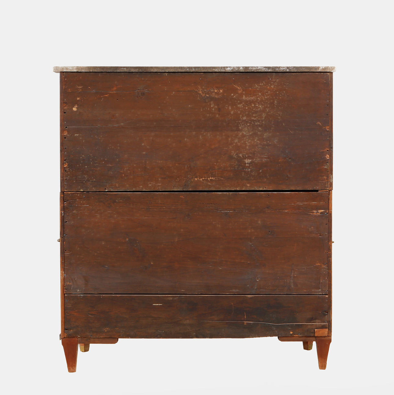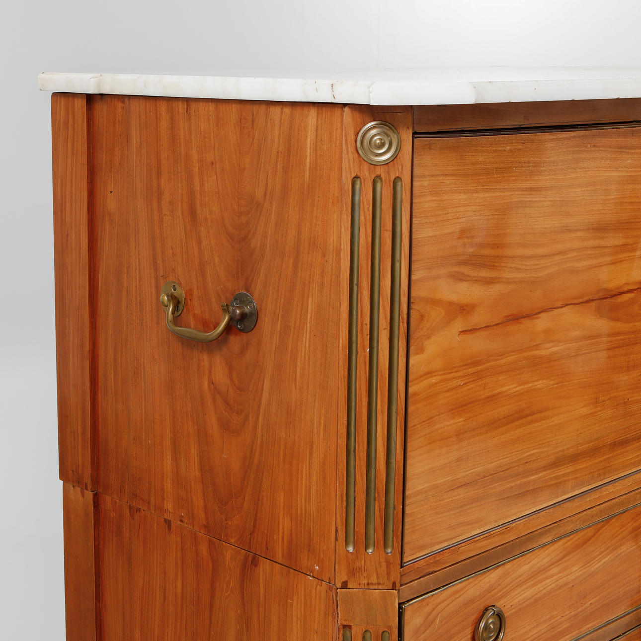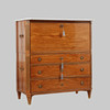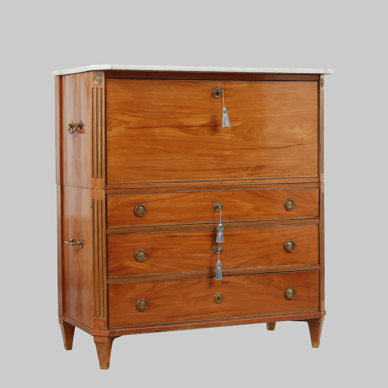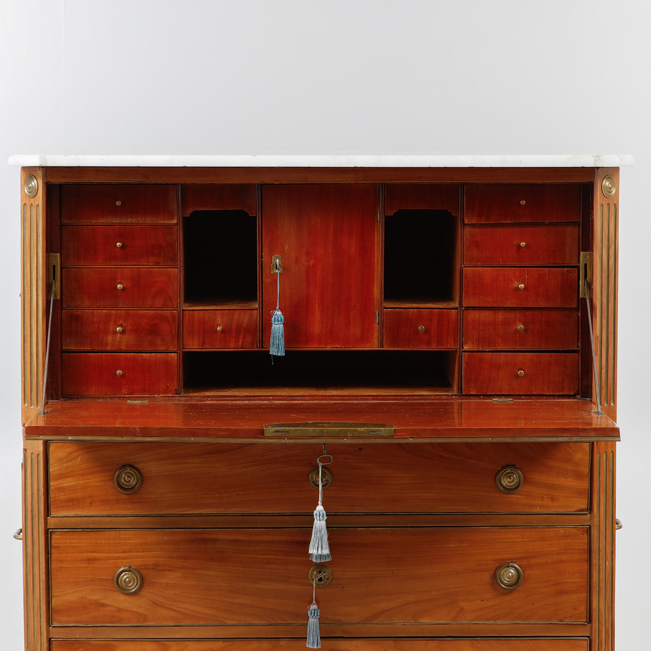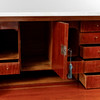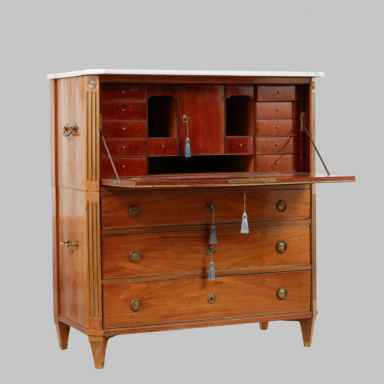 Mahogny. Tvådelad rak form ,ed profilerade ben och hörn, 3 lådor i nederdel och överdel med skrivinredning bakom klaff, skiva av vit marmor, bärhandtag och draghandtag i mässing. Längd 116 cm, bredd 54 cm, höjd 130 cm.