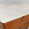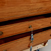 Renoverad och kompletterad, blekt, sprickor, fanerbortfall, lösa delar.