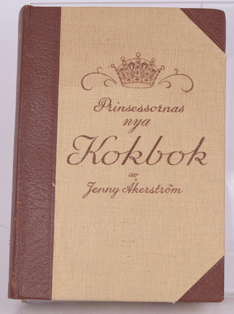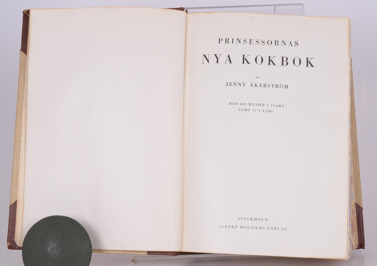 Prinsessornas nya kokbok. Bonniers 1948. Liten 4:o. XIX, 1051, (1) s. Illustrerad med 639 bilder i svart samt 57 i färg. 1:a upplagan. Förlagets dekorerade halvfranska band med marmorerat snitt.