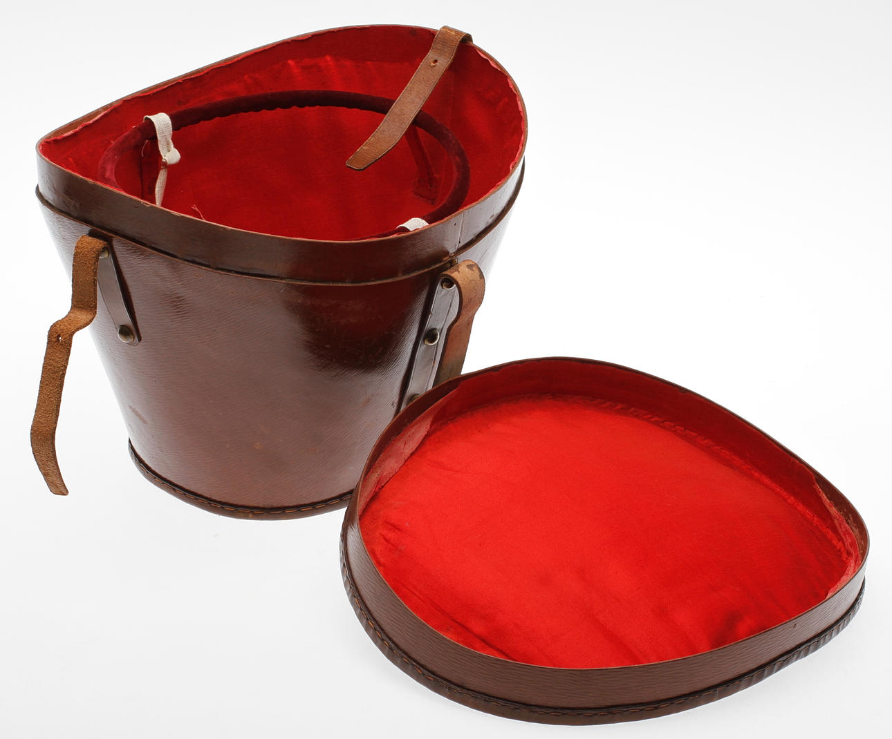 Hattask i läder. Hatt märkt Import Efr. Isacson, Mariestad.