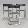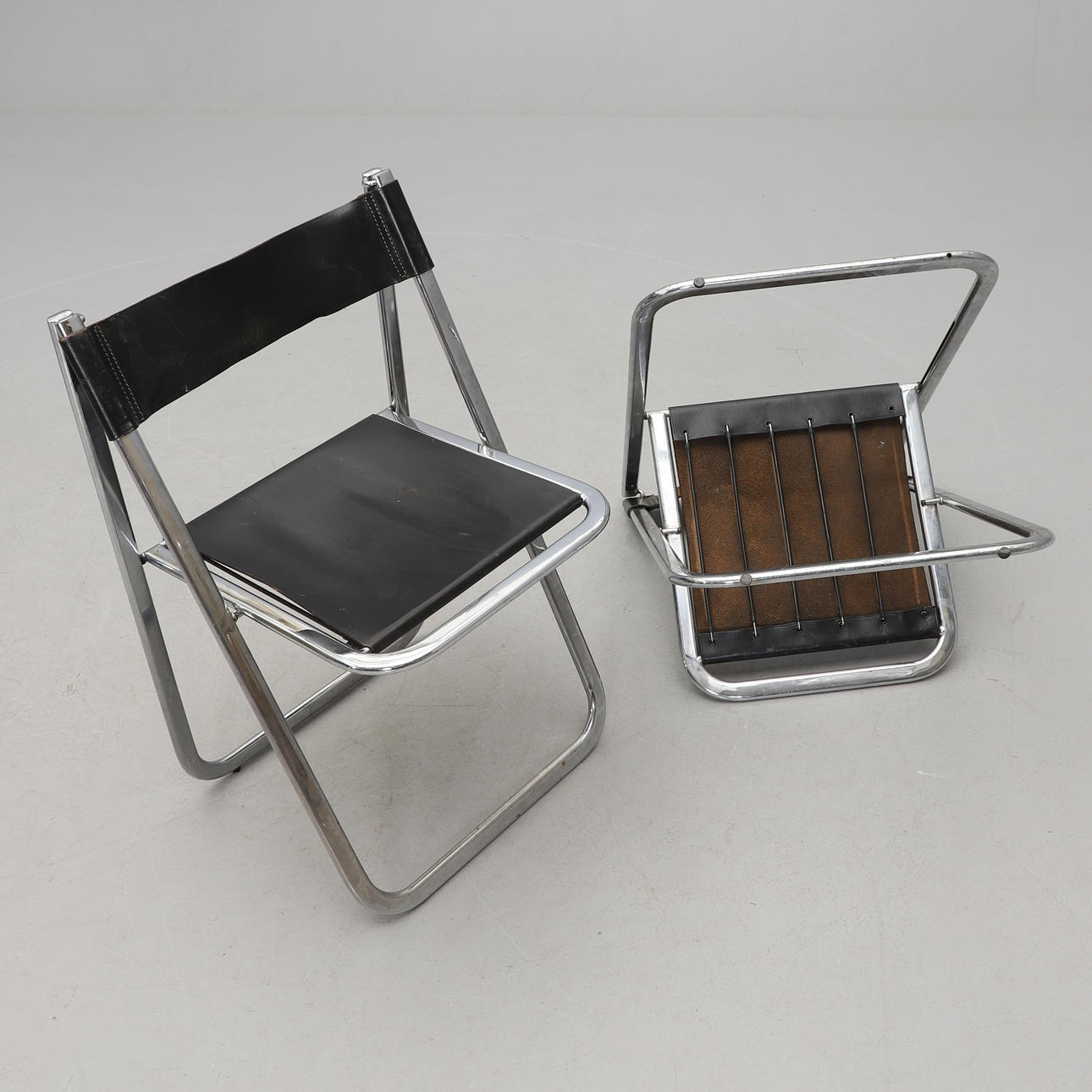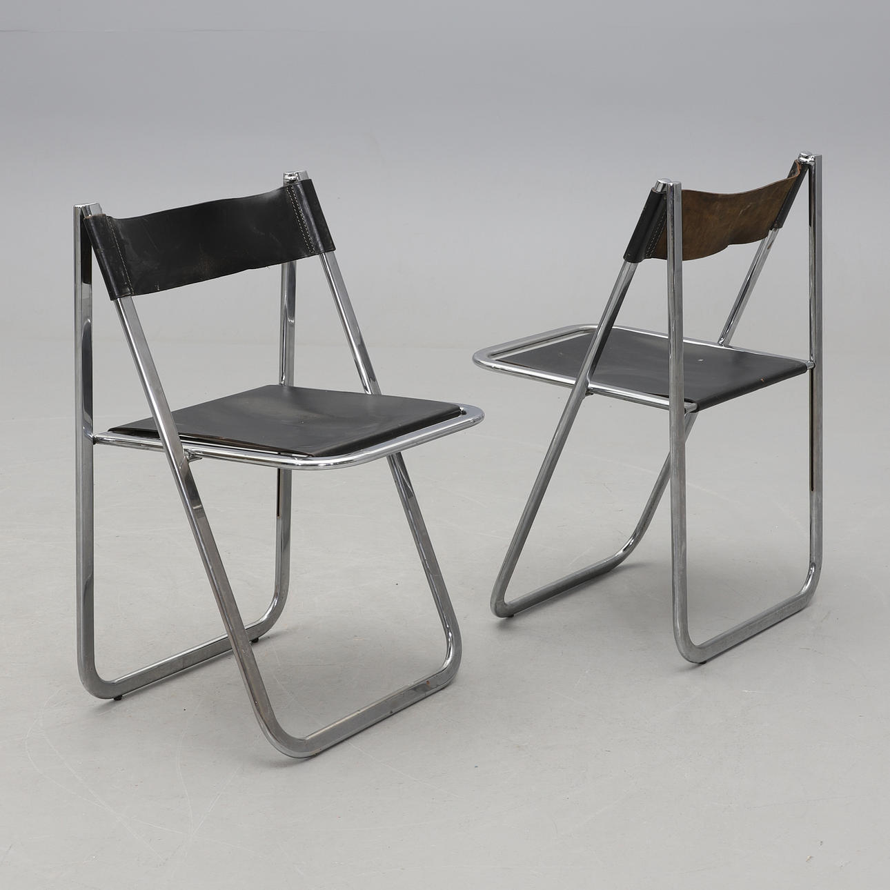 Stomme av förkromad metall. Sits och rygg av svart skinn. Omärkta. Bredd 49, djup 45, rygghöjd 79, sitthöjd 46 cm.