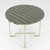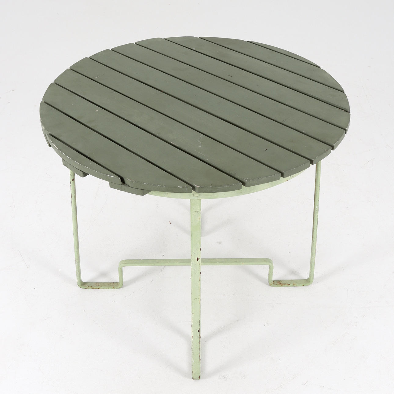 Bruksslitage, senare bemålade. Måsbajsfläckar. skada på ett av bordets fäste mellan bordskiva och underrede.