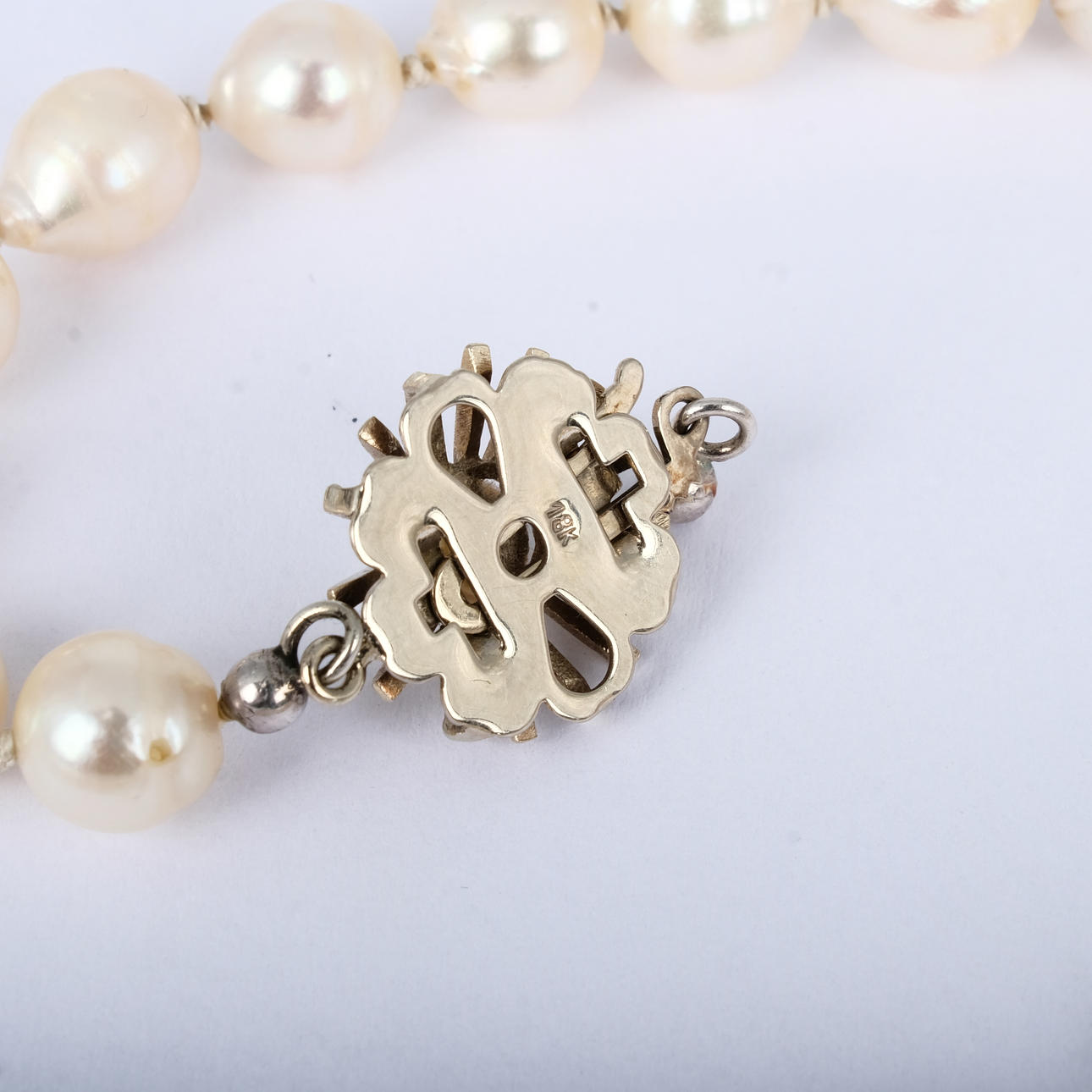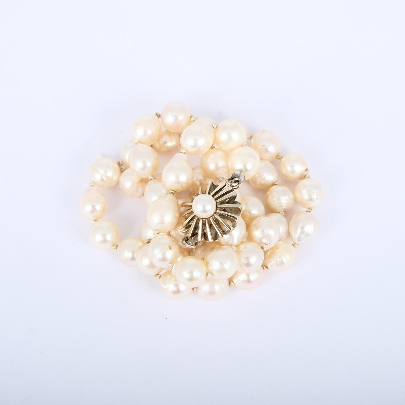 Odlade pärlor 7 mm. Längd: 47,5 cm Vikt lås (med pärla): ca 2,3 gram.