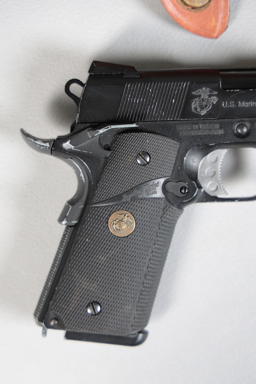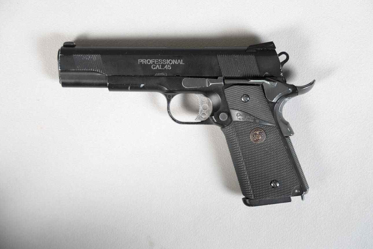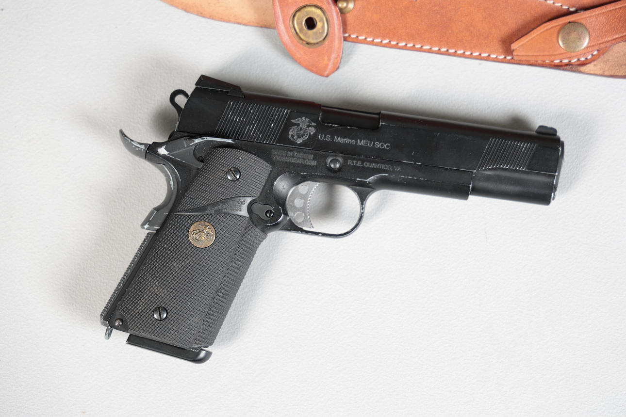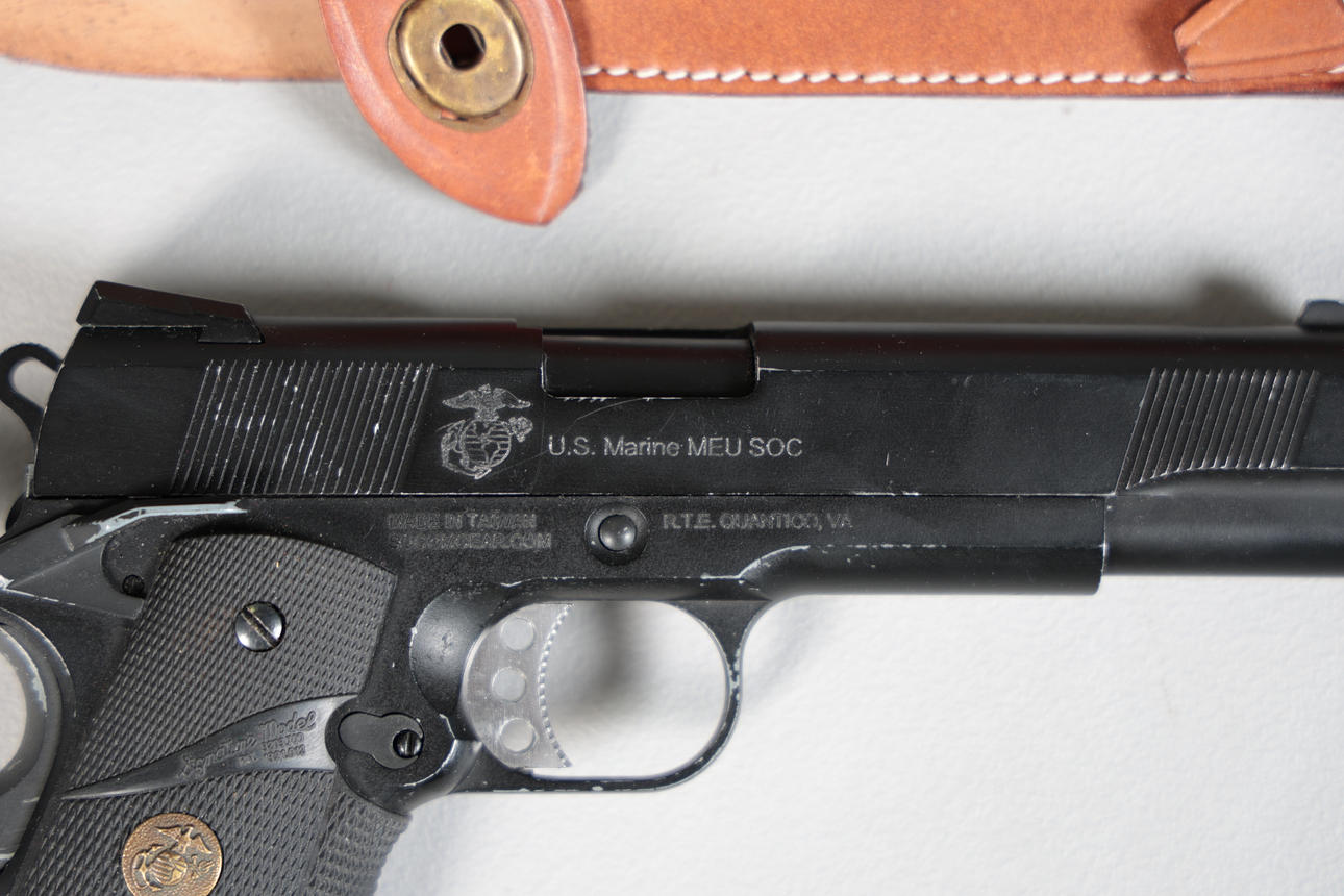 MEU .45 Airsoft-pistol, tillsammans med reproduktion militärt axelhölster, och originallåda med två reservmagasin