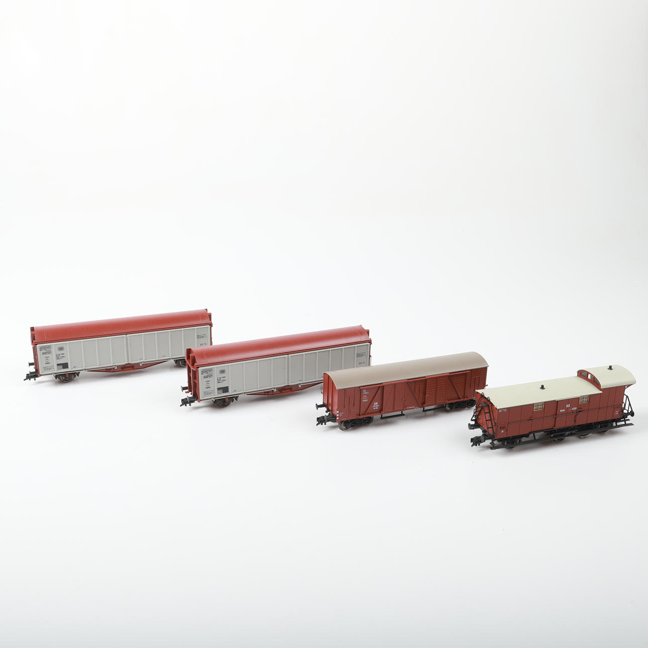 1 ånglok med tender, 2510, längd ca 23 cm 14 godsvagnar, längd ca 10-18 cm.