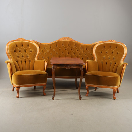 Åldersanpassat skick, repor och gnidning i lädret, patina, tre-sits gnidade på plats, hörnmoduler delvis guriggade/öppen söm, båda tvåsitsiga delvis med öppna sömmar/hål, några knappar saknas.