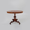 Skiva fanerad med mahogny. Tredelad pelarfot med skuren dekor. Längd ca 99 cm, bredd ca 67 cm, höjd ca 77 cm.