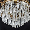 Stomme i mässing behängd med slipat glas. Fem ljusarmar, sex elektriska ljuspunkter. Diameter ca 48 cm, höjd exkl. kedja och takkåpa ca 60 cm.