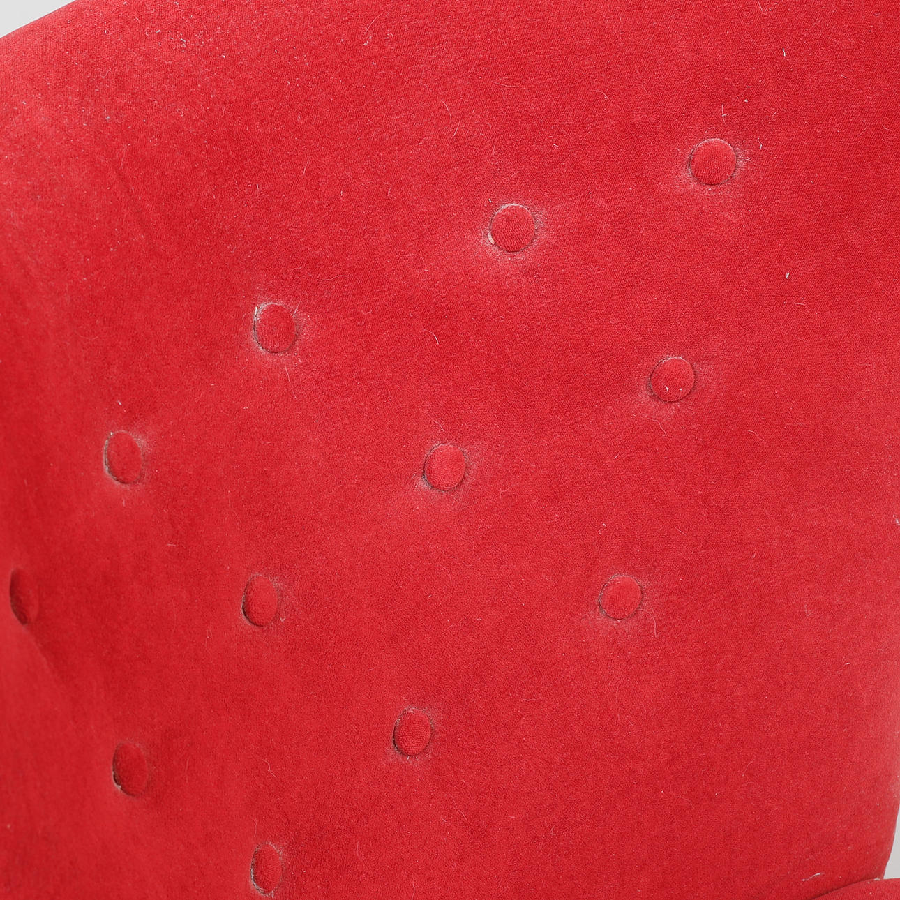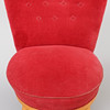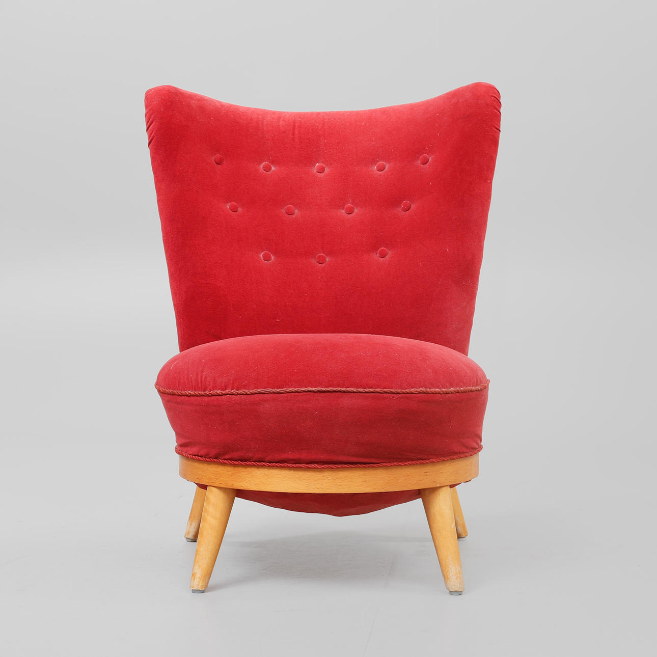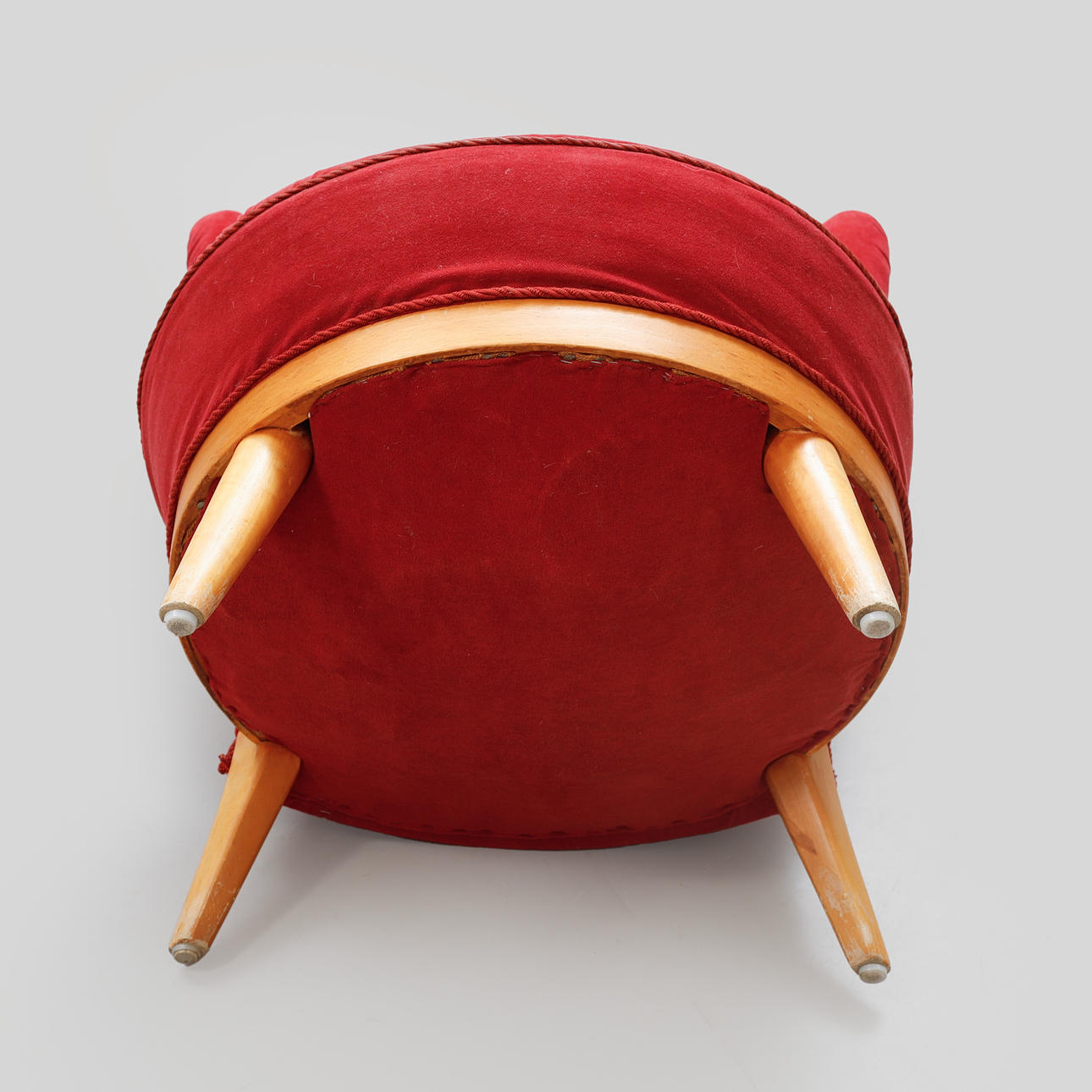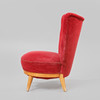 Helstoppad med röd sammetsklädsel, djuphäftad rygg. Ben i bok. Bredd ca 70 cm, sitthöjd ca 41 cm, rygghöjd ca 90 cm.