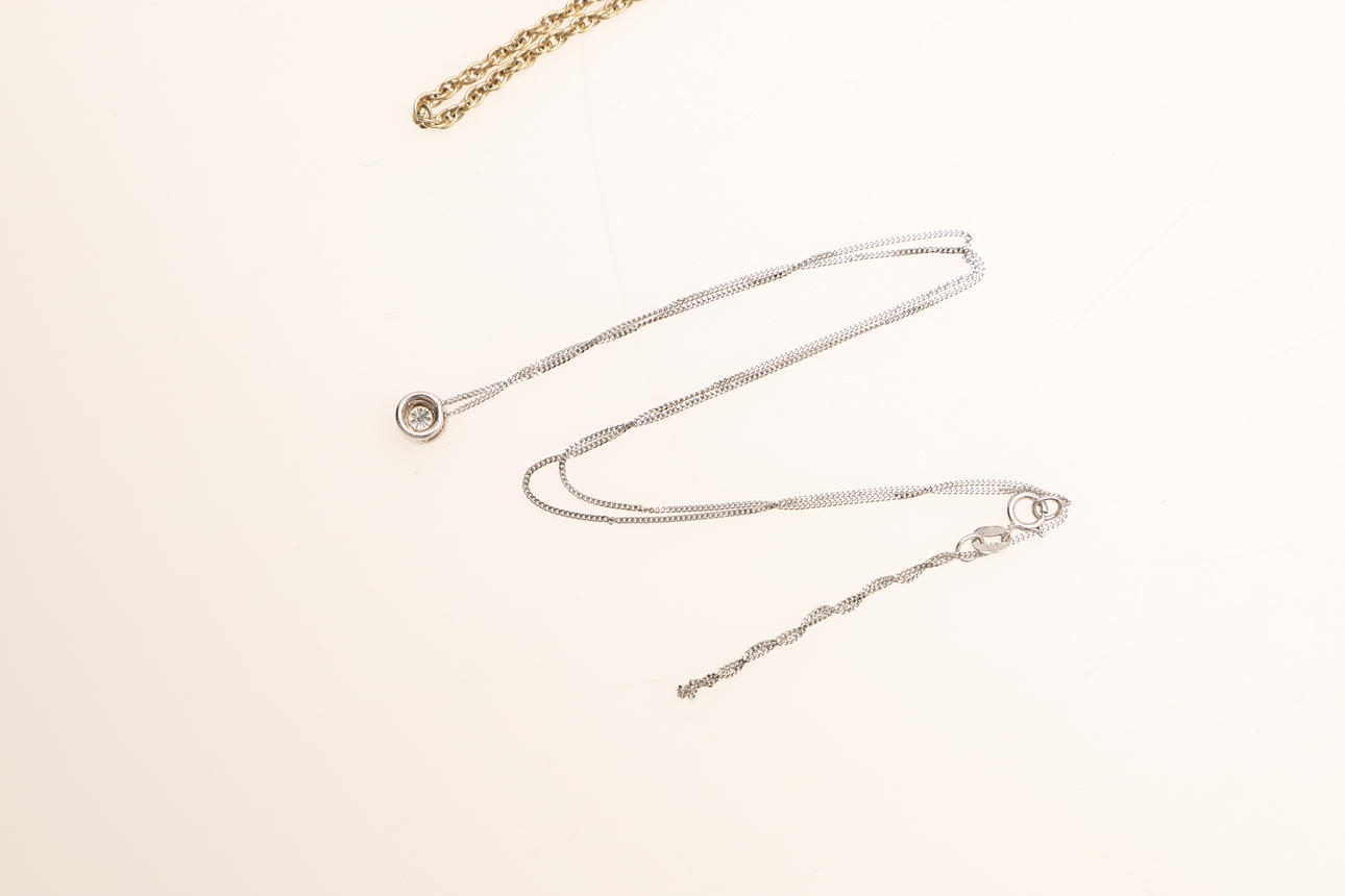 En solitärdiamant i vitguld på fin länkkedja och ett 9kt gult guld hjärtformat hänge infattat med diamanter på kedjan, totalvikt 12.7g.