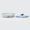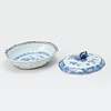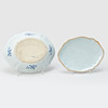 Profilerad brätt. Dekor av blommor i underglasyrblått. Lock krönt av knopp. Längd 27 cm.