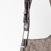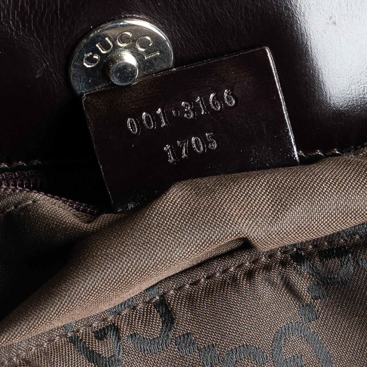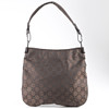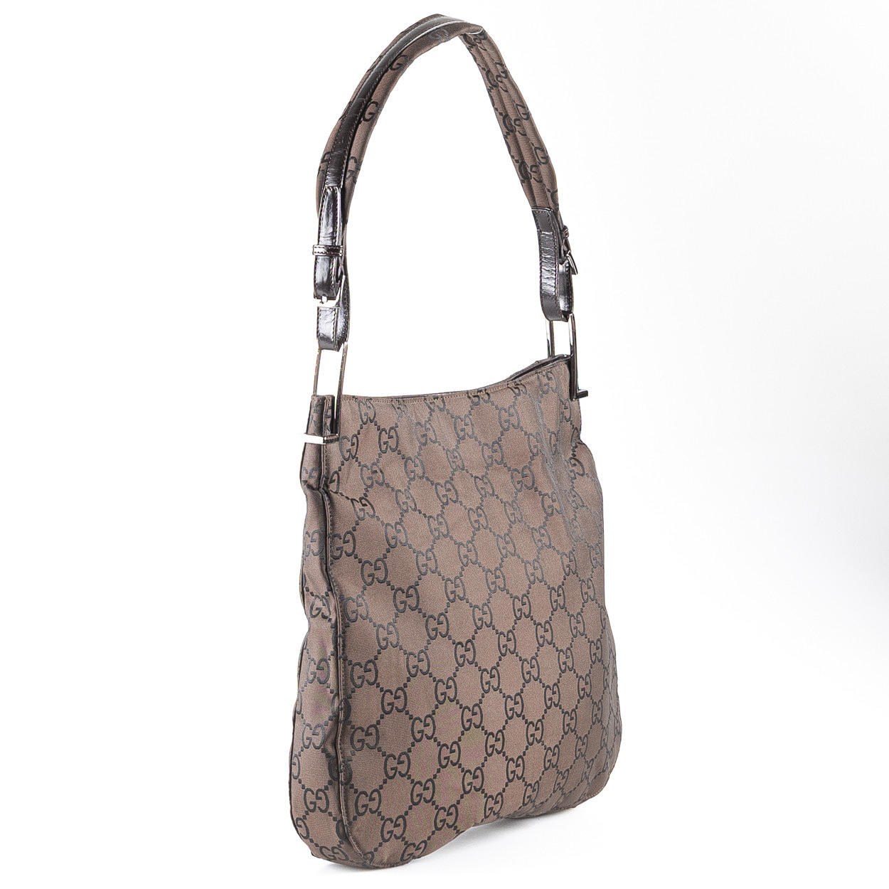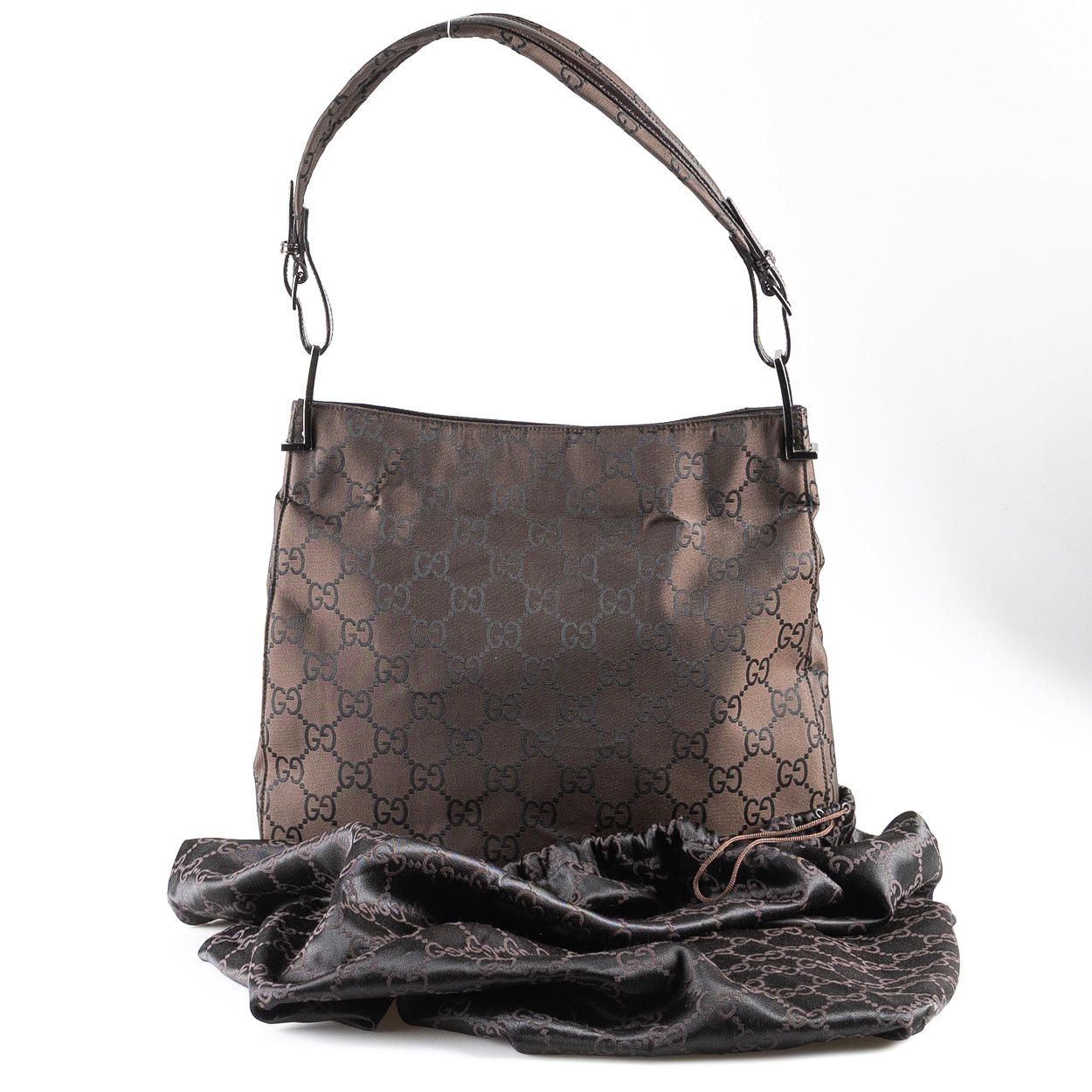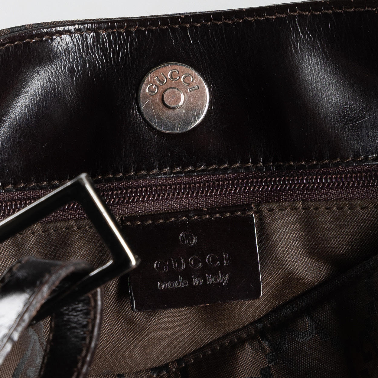 Monogrammönstrad brun nylon med hardware i metall och detaljer i högblankt brunt läder. Huvudfack med magnetlås, inredning med ett blixtlåsförsett sidofack. Märkt ® GUCCI, made in Italy, samt 001 8166 1705. Dustbag medföljer. Axelrem drop ca 24 cm. Väska ca 34x31x4 cm.