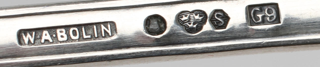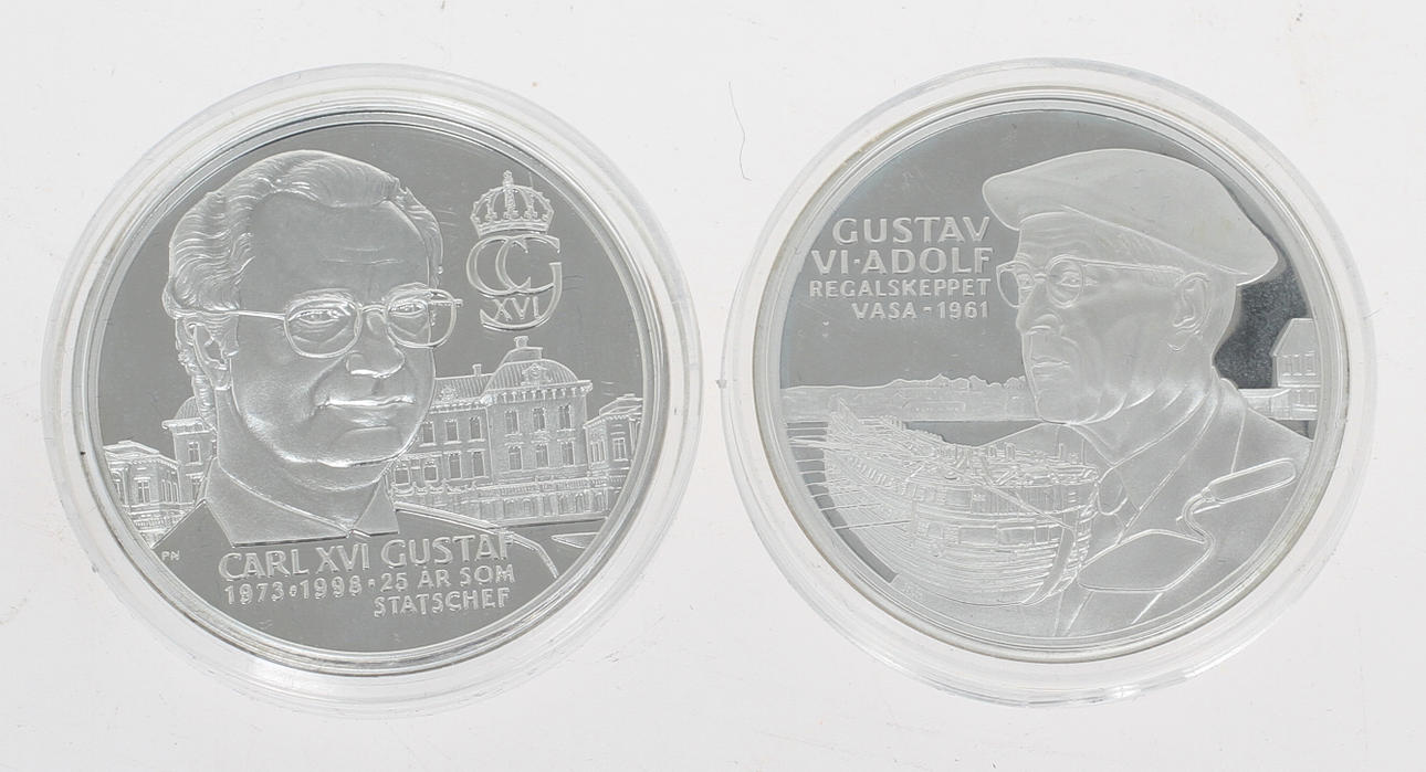 Supkopp, 2 medaljer Sveriges Regenter, 1 par manschettknappar, fingerborg, 3 skedar varav en W A Bolin.