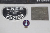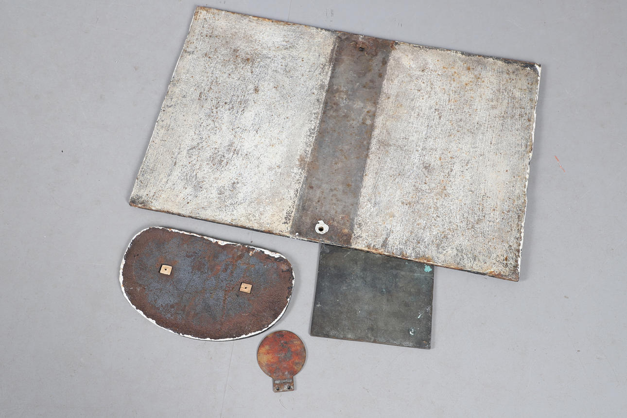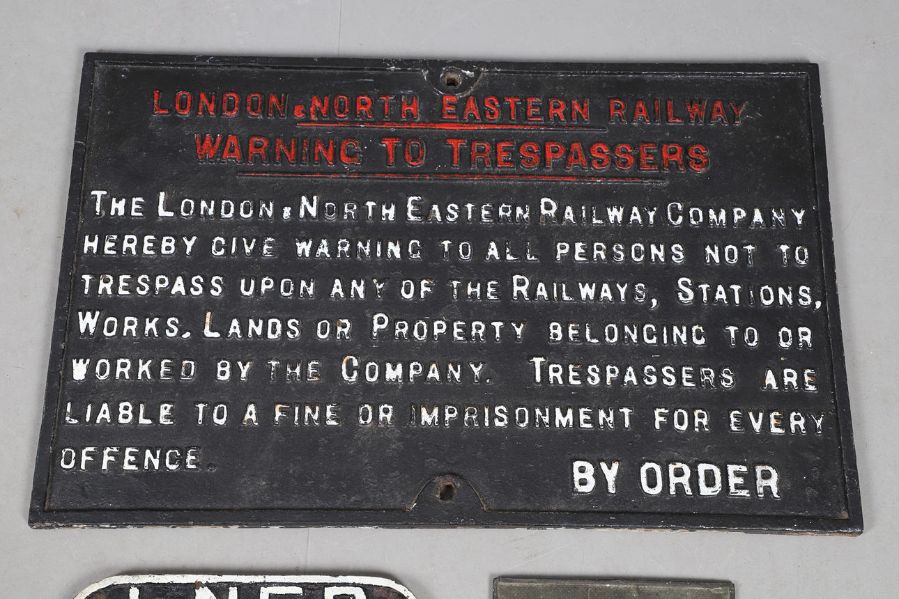 Storlek på största 66x43cm. En LNER-skylt som varnar för intrång. Ett tecken 'L.N.E.R, 21 ton, 1941, 252108, ett annat 'Chas. Burrell & Sons Tillverkare, Thetford, nr 3700. Och en liten skylt ”Lokomotiv samhällsväg”.