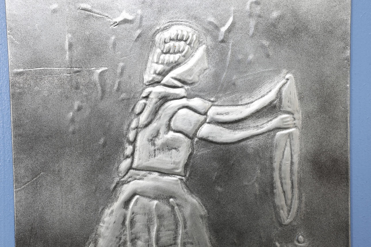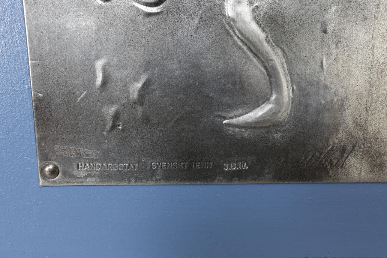 Tenntavlor, 2 st, signerade Handarbetat svenskt tenn, A Mihad, inspiration från John Bauers måleri, monterade på spånskivor, 55X39,5 cm.