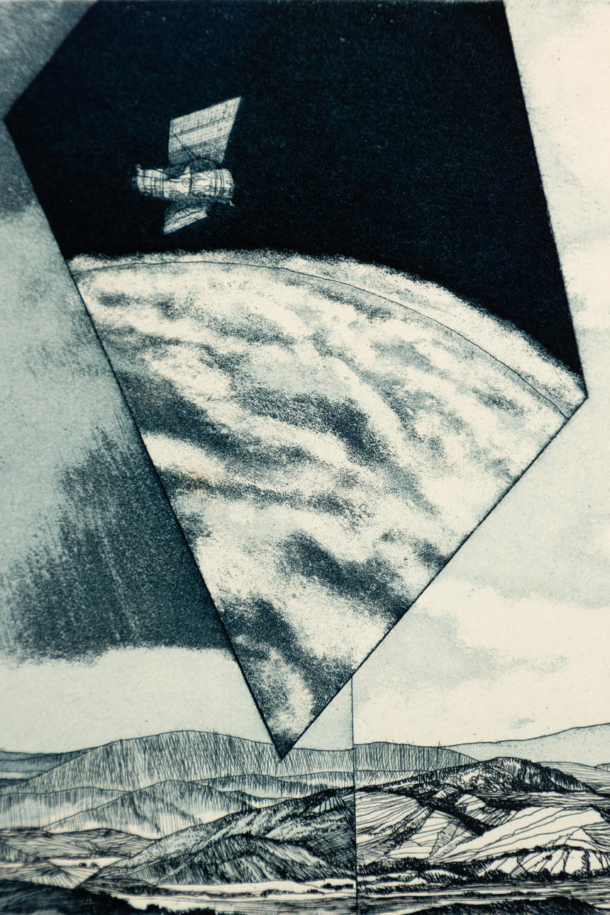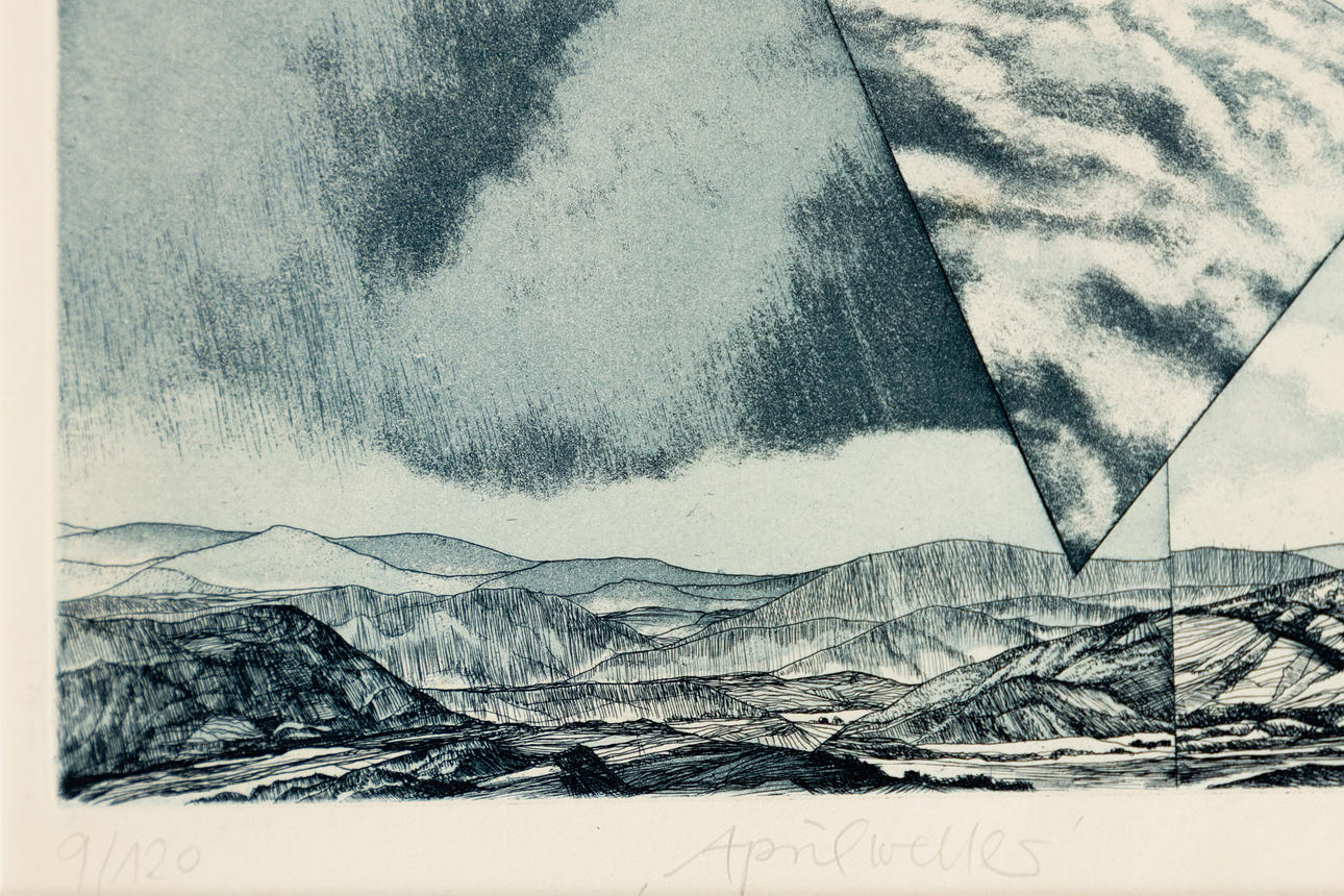 Peter Sylvester (1937-2007), aprilväder, etsning i blått, 1973, signerad, daterad, numrerad och titeln, exemplar 9/120, ca. 17 x 41 cm, inramad bakom passepartout och glas, med ram ca. 32 x 56.