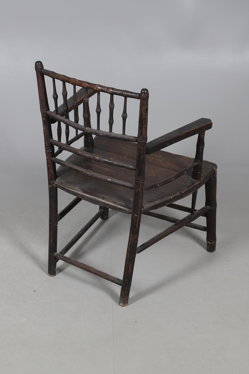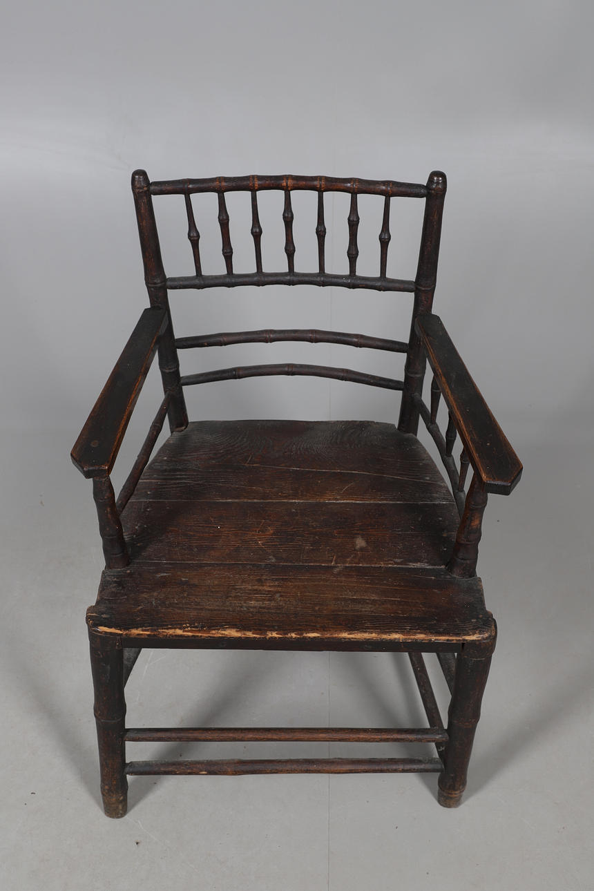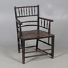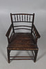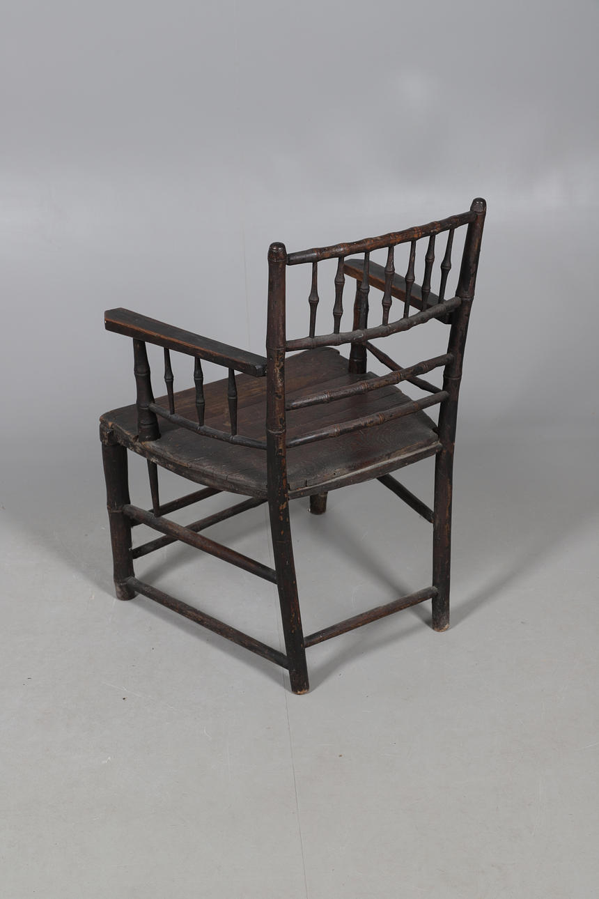 En fåtölj i Sussex-stil, med spolvridna stöd och avsmalnande armar. Med en panelad sits och tvärbårar. Några bitar saknas, 77 cm höga, armar 53,5 cm breda.