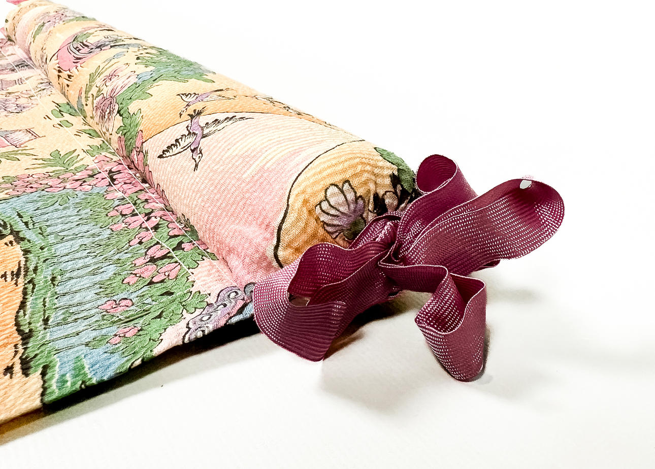 Dekor av kvinnor i drakbåt, landskap, blommor, växter. Längd ca 132 cm, bredd ca 60 cm.