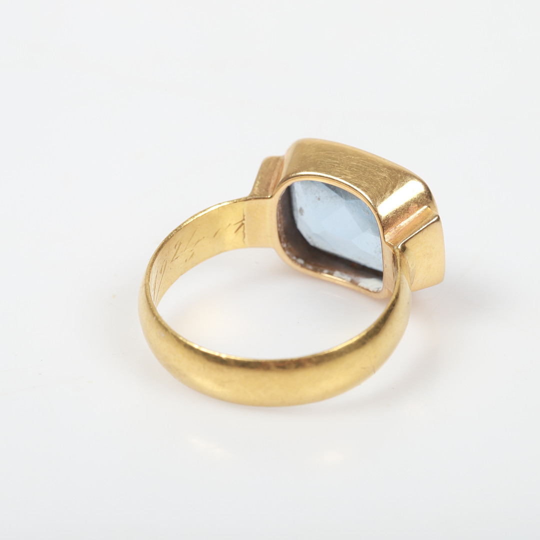 4418639. RING, 23 K guld med blå sten.