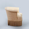 Textilklädsel med växtmönster samt hängande fransar. Svarvade ben i bonat trä. Två hjultrissor. Sitthöjd 45 cm.