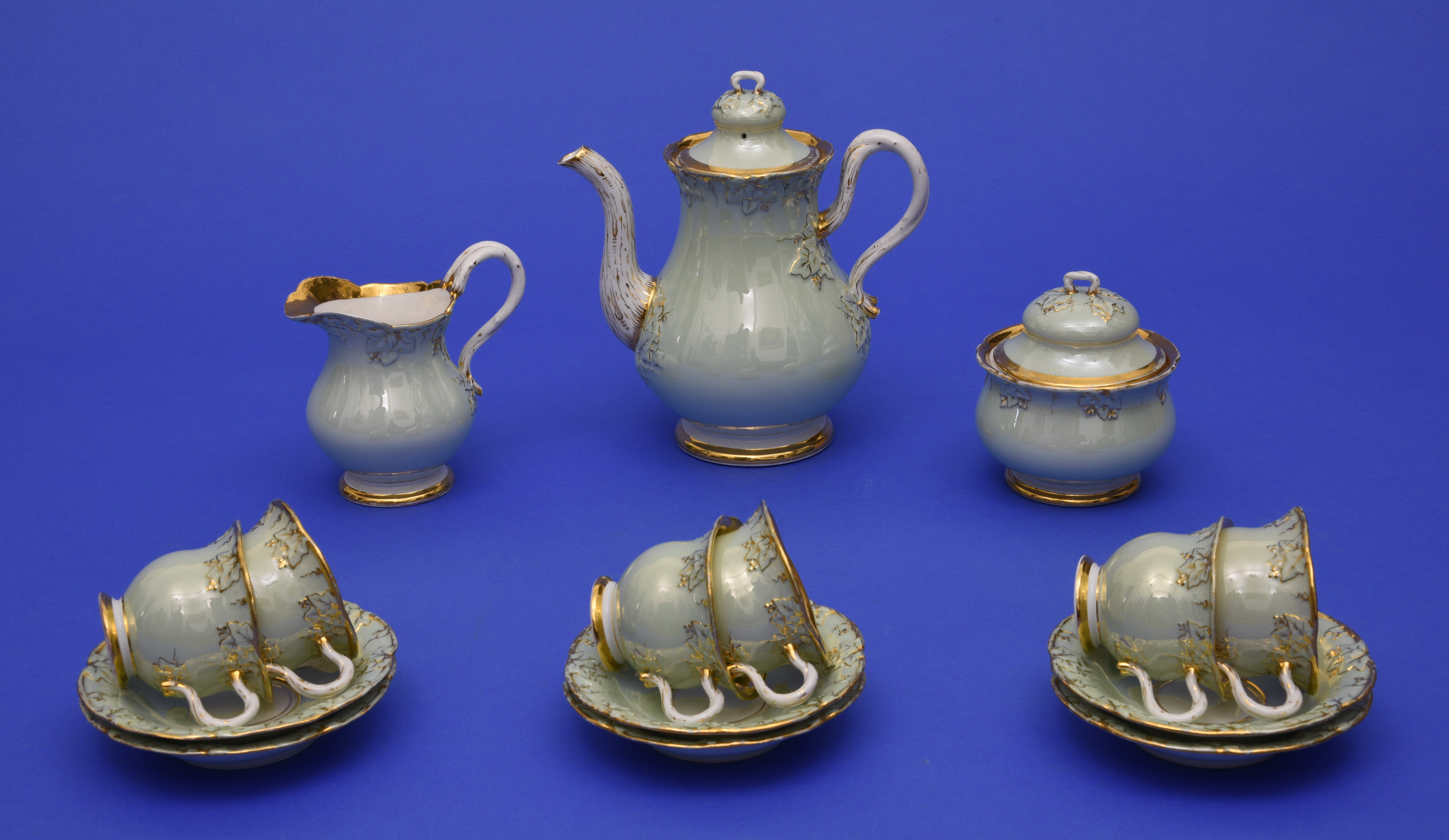 442359. MEISSNER KAFFEESERVICE. ljusgrön med stänk guld.