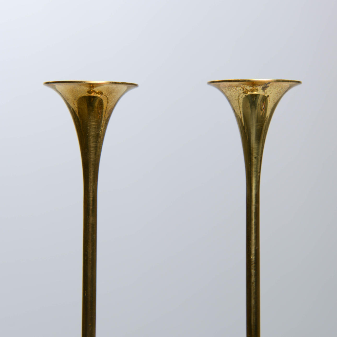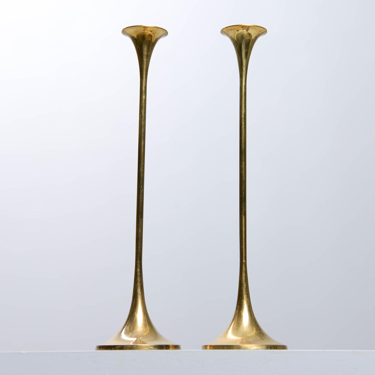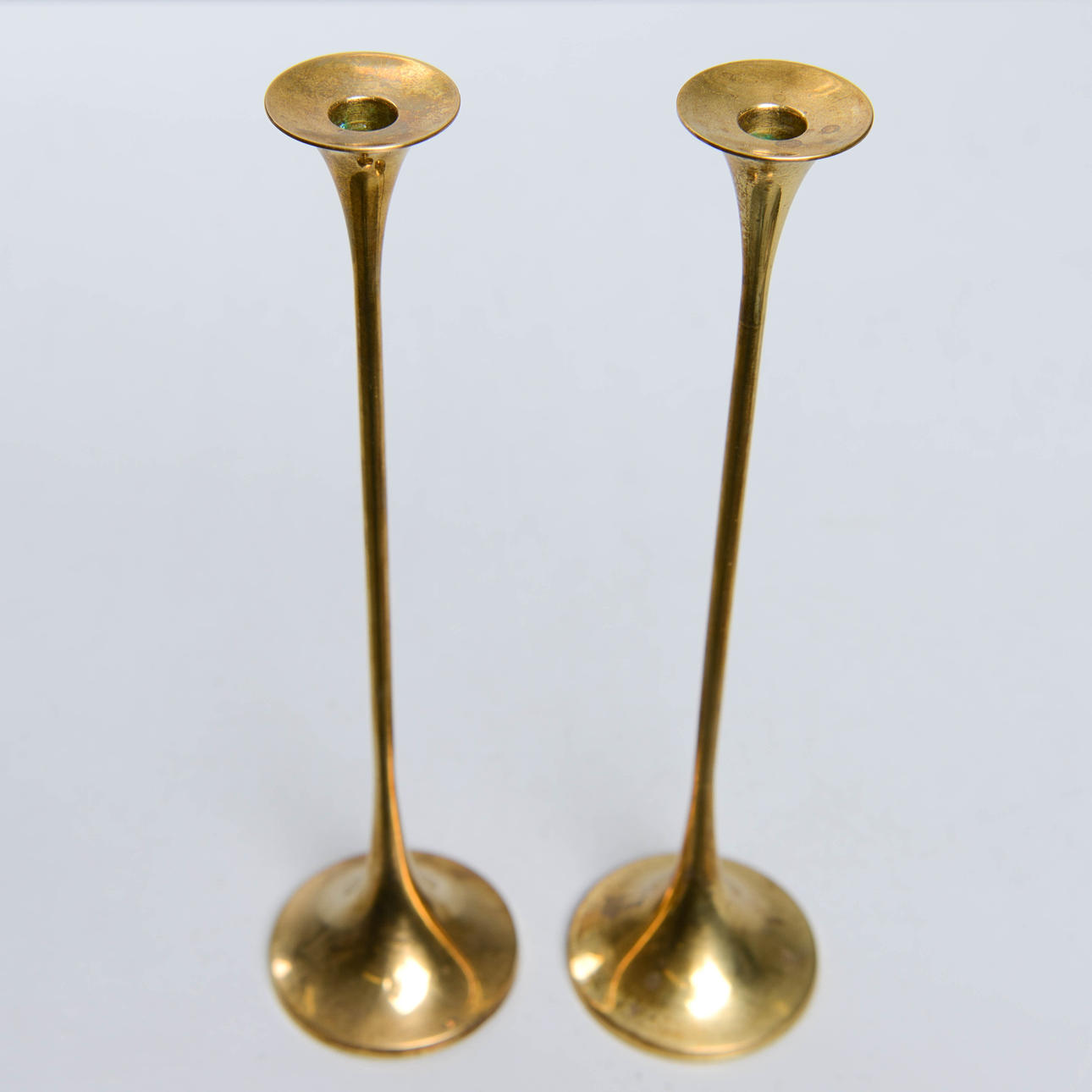 Stämplade undertill. Höjd: 26 cm. För smala ljus.